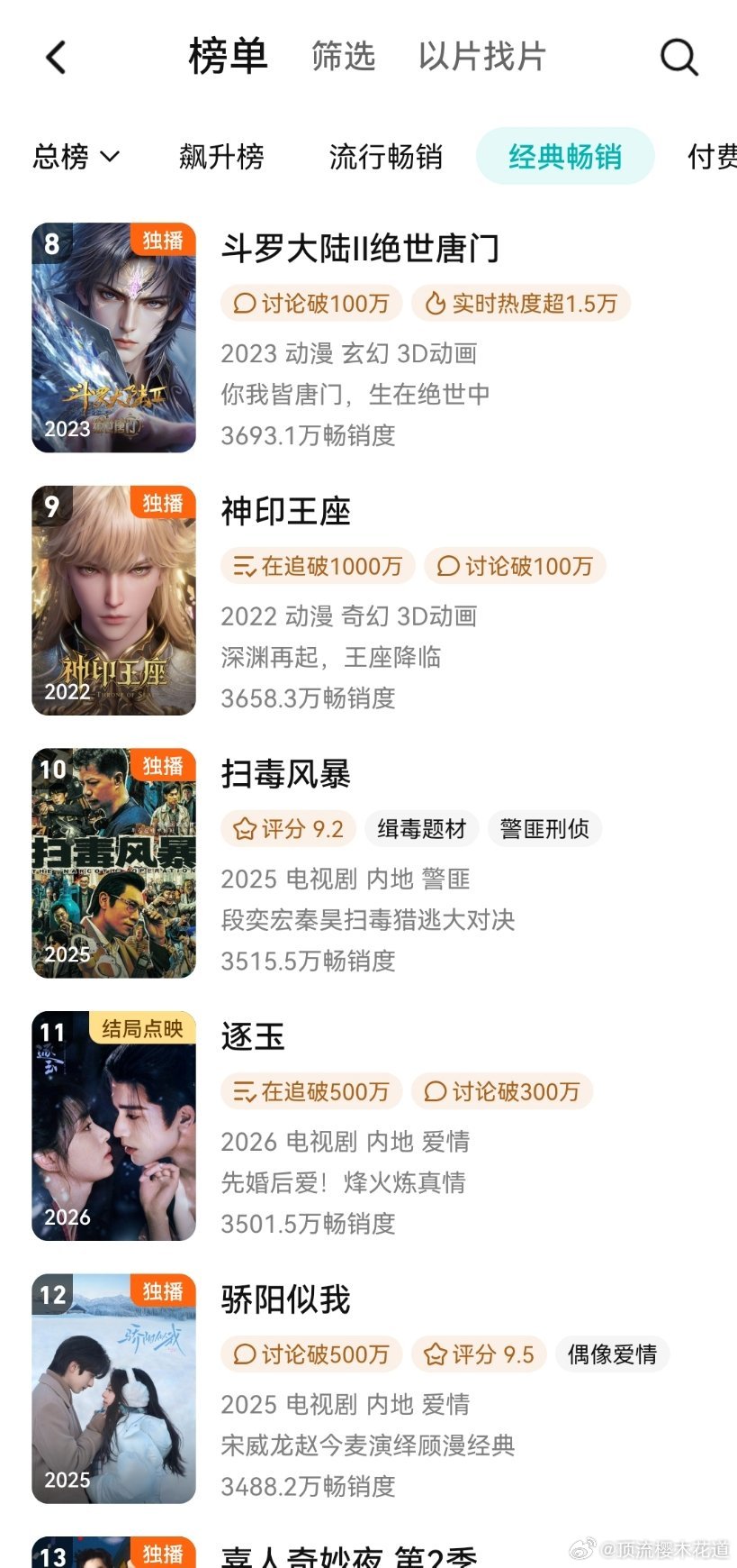 开播第三天,周榜依然没登顶,倒是逐玉年榜11了,热播期结束进前十应该问题不大。建议提灯别整天拉完全不是一个赛道的正剧做对比了,直接对标逐玉,都是古偶,都是2026年的剧,单平台拉新如果比不过95生花的双平台之一的拉新,真的该反省反省了。