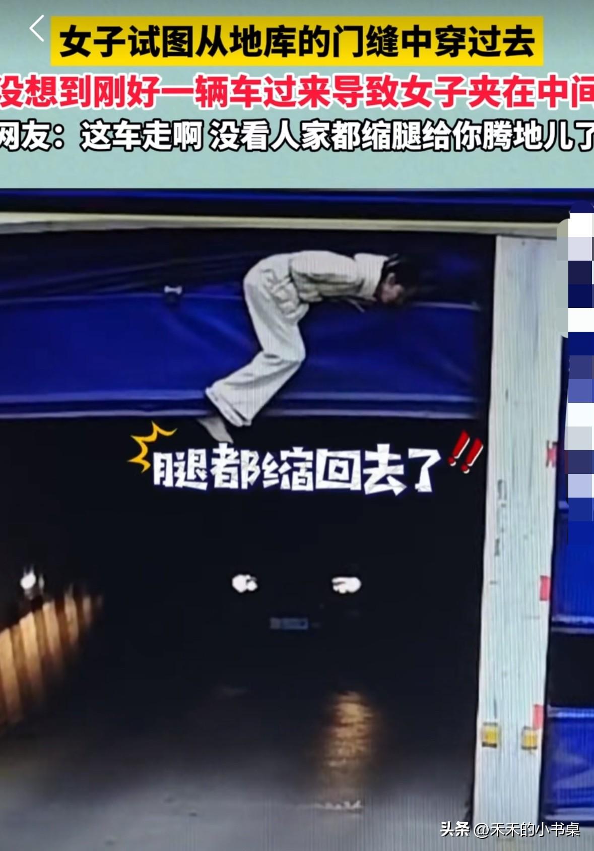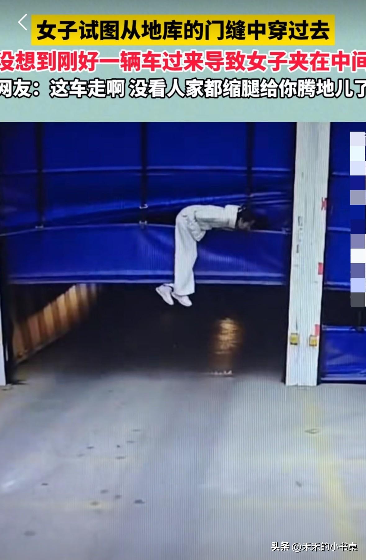 女子想从地库的门缝里钻过去,没想到刚好过来一辆车,门自动升起,女子直接被夹在门上同步上移。 女子怕车撞到自己的脚,还把脚往里缩一下。 这种行为,太危险了,以后别拿自己的生命开玩笑。 评论区:“如果是我开车,我就一直在那停着,让她在上面挂一天。”