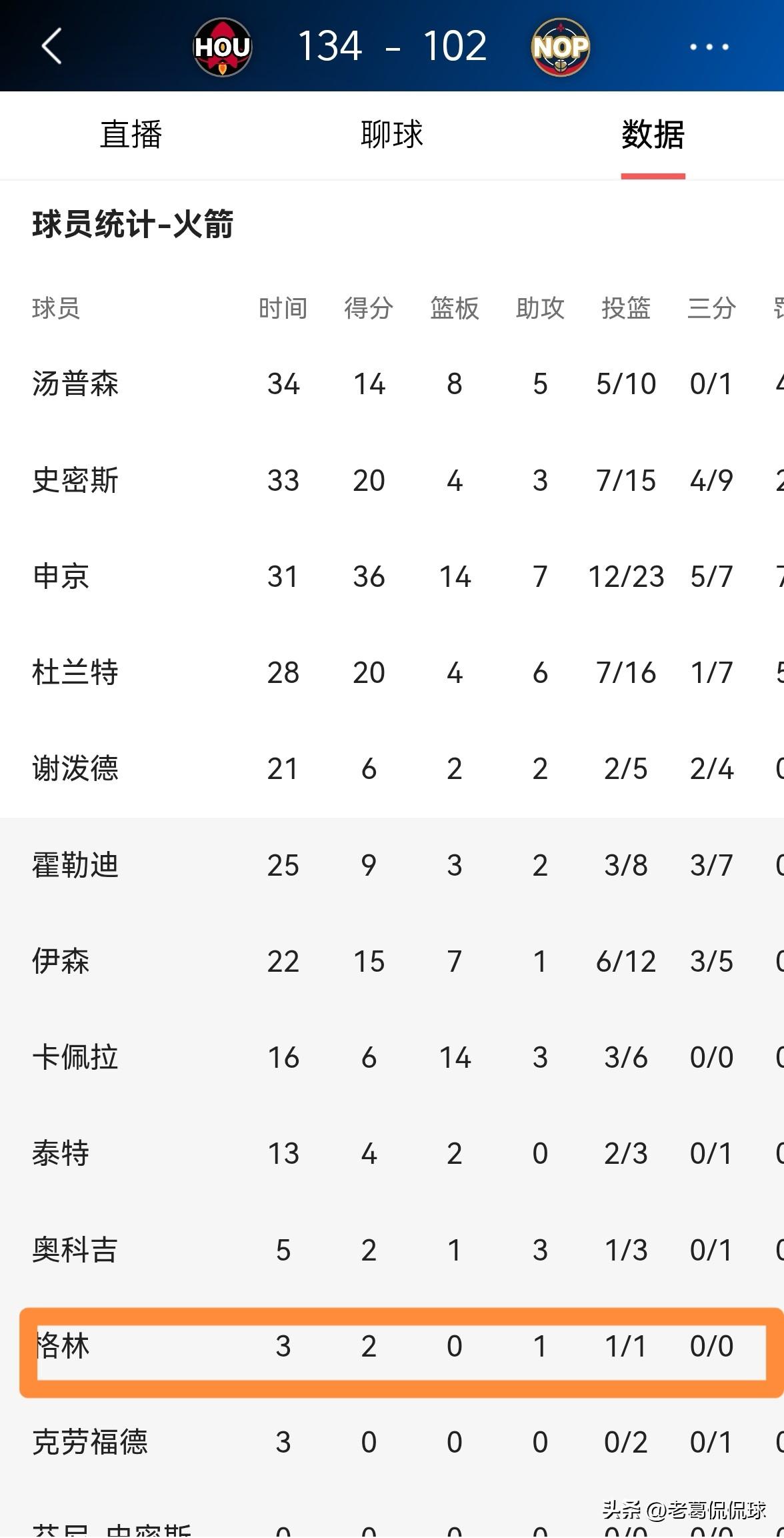 火箭老将杰夫-格林终于又得分了!在今天火箭客场以134:102大胜鹈鹕的比赛中,老格林不仅得到了出场机会,而且在时隔多场比赛之后再次得分。