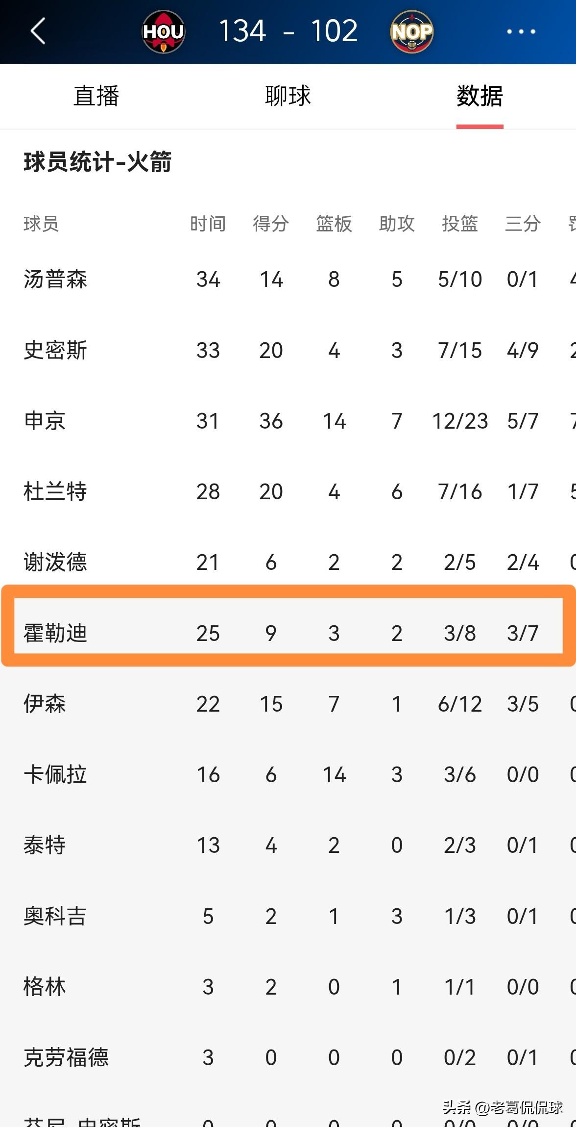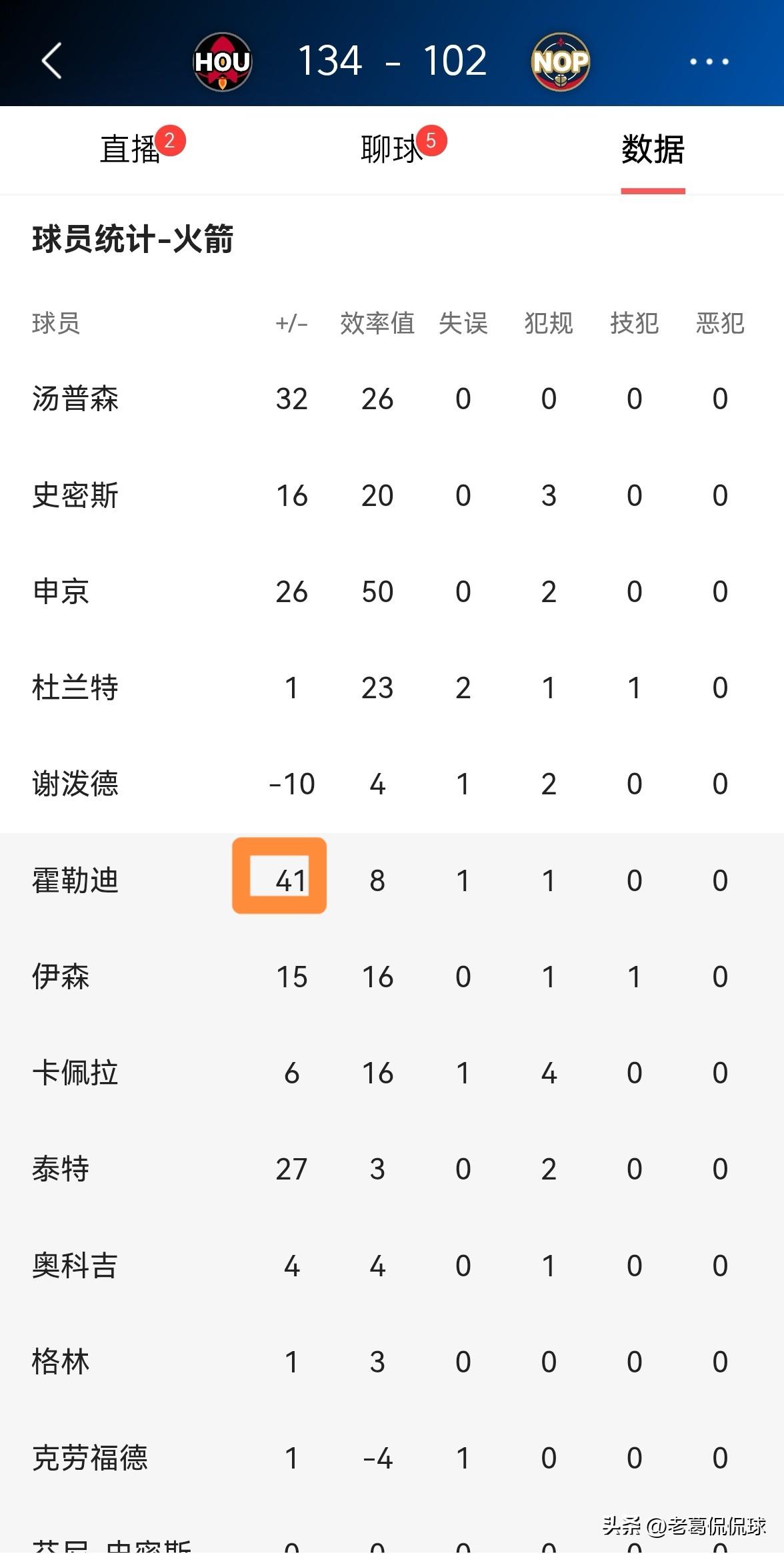 火箭大将霍勒迪的场上正负值真是高的吓人!在今天火箭客场以134:102大胜鹈鹕的比赛中,霍勒迪的场上正负值不仅高达+41,而且高居全队第一。 整场比赛下来,霍勒迪替补出战25分钟,三分球7中3得到9分3篮板2助攻,他的场上正负值为+41。 这充分说明霍勒迪对于火箭是不可或缺的,霍勒迪堪称球队的替补神兵。