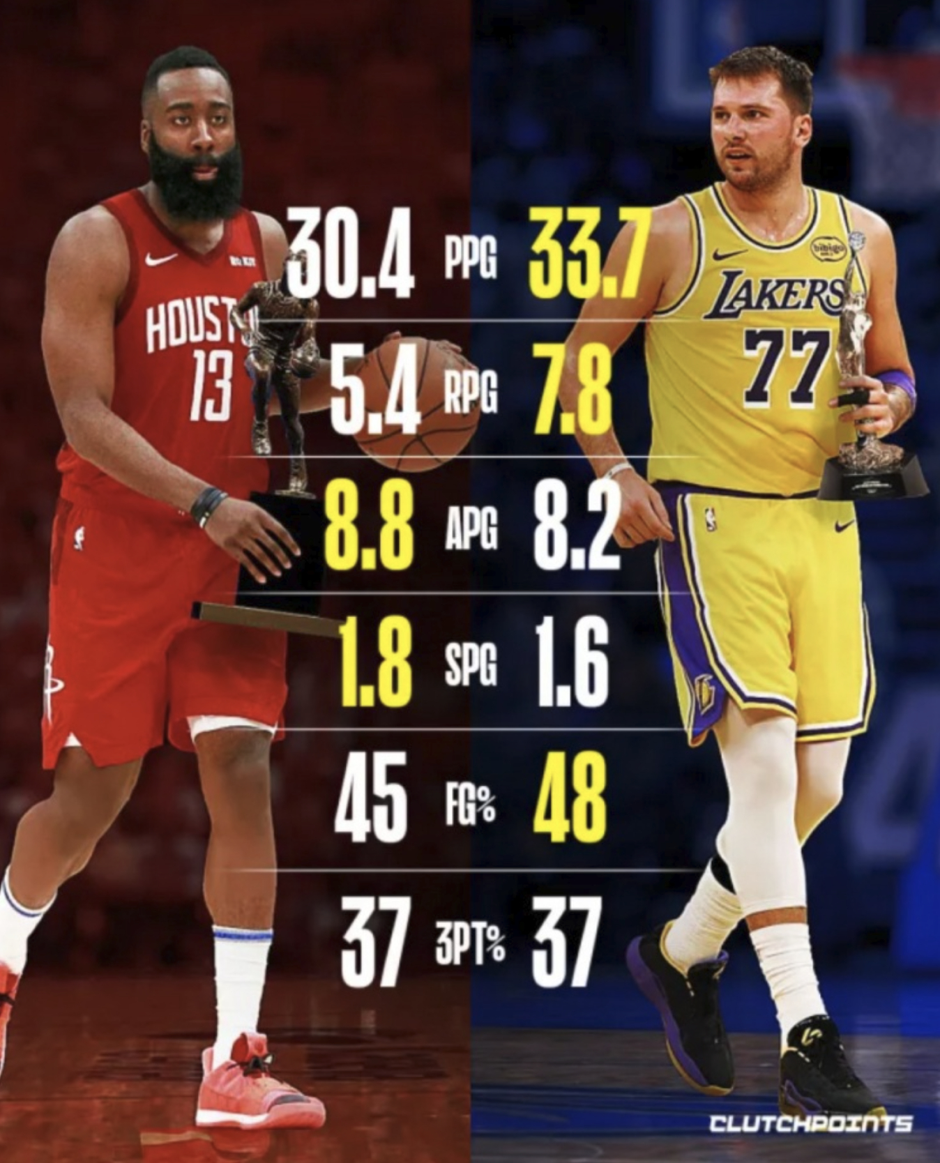 东契奇本赛季与哈登的MVP赛季数据对比: