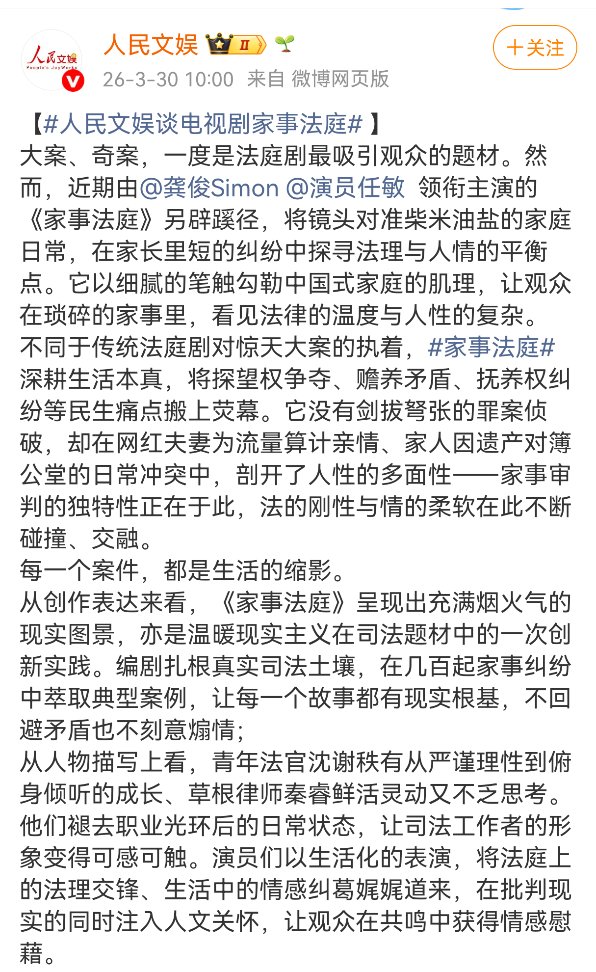 人民文娱评龚俊《家事法庭》:每一个案件,都是生活的缩影。唯有扎根生活,读懂人心,