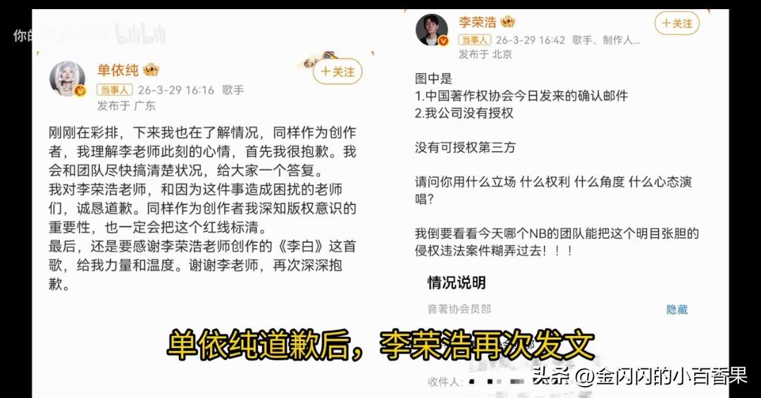 李荣浩是合法维权、一击致命;单依纯是侵权在先、公关崩盘,纯属自己把路走窄了。单依纯这次真是把自己路走死了,版权意识为零就算了,公关还前后矛盾,一边甩锅主办方一边强行揽责,典型又当又立,道歉全是在做姿态保人设。 李荣浩直接晒证据硬刚维权,一句话戳穿本质:没同意你还唱就是违法,一击致命引爆舆论。本来《李白》就是人家的核心作品,还被大魔改商用,动了别人的版权收益,不撕破脸才怪。 再加上她本身没什么原创代表作,全靠翻唱,这次踩中版权底线,被主流抵制完全不意外,纯属自找的。 侵权在先,公关拉胯,又当又立,李荣浩合法维权一击致命,单依纯彻底翻车纯属活该。