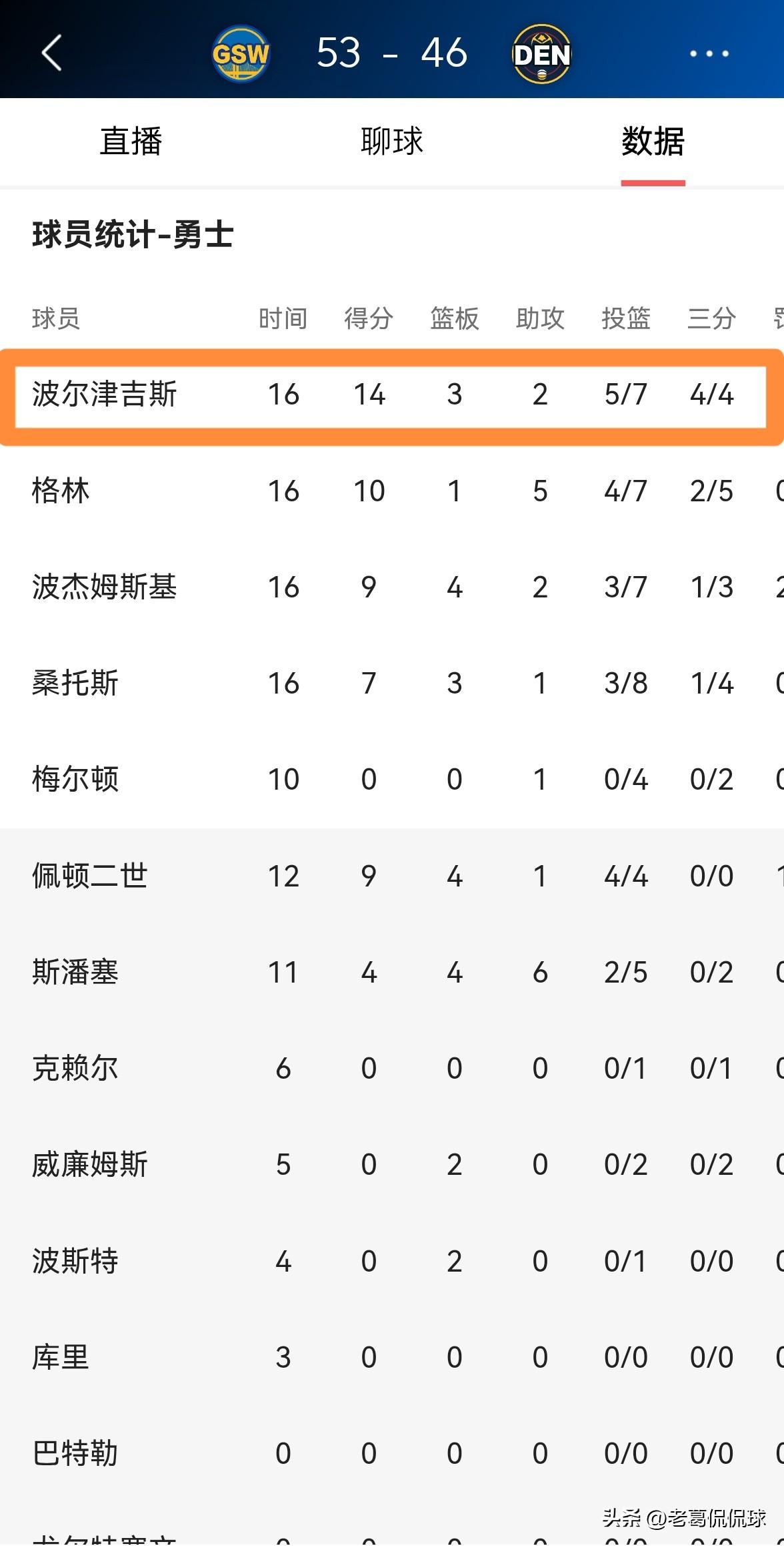 勇士球星波尔津吉斯真是手感滚烫!在今天勇士客场挑战掘金的比赛中,目前双方半场战罢,勇士凭借着波尔津吉斯的精彩发挥以53:46领先对手7分。在前两节比赛中,波尔津吉斯的投篮手感真是非常滚烫,他在首发出战的16分钟里,投篮7中5,其中三分球4中4非常高效的砍下14分,还有3篮板2助攻1抢断,他的场上正负值为+6。 老实说,以波尔津吉斯在上半场比赛中的火热手感来看,我预感本场比赛波尔津吉斯会砍下30+。