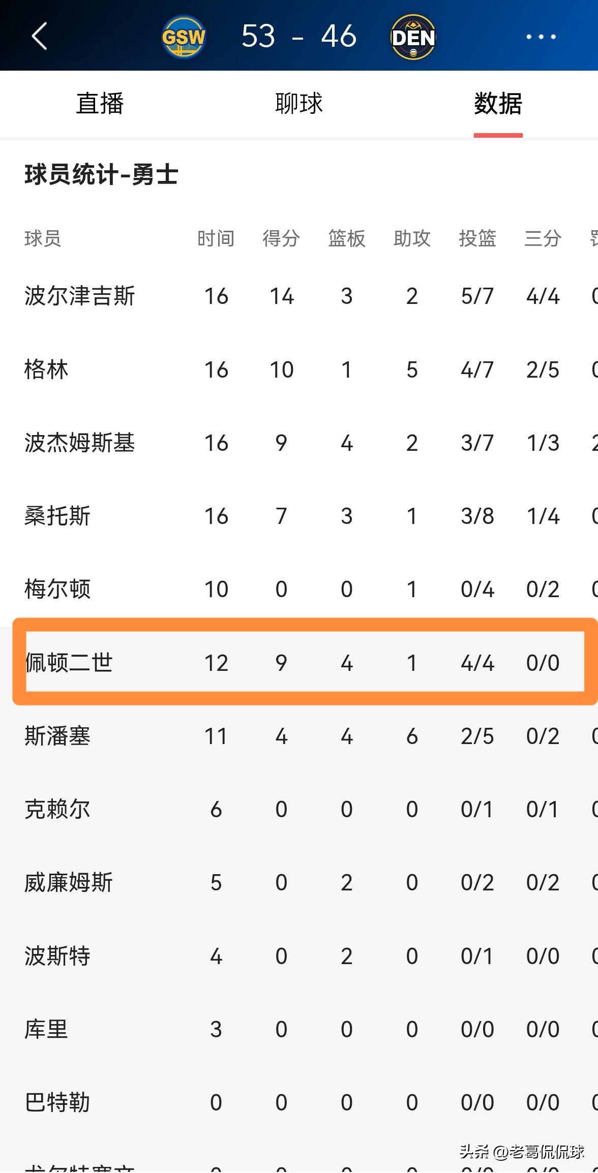 勇士悍将佩顿二世真是让人吃惊不已!在今天勇士客场挑战掘金的焦点战中,目前双方半场战罢,勇士暂时以53:46领先对手。让人感到非常吃惊的是,向来不擅长投射的佩顿二世却在前两节比赛中弹无虚发。 在上半场比赛中,佩顿二世替补出战12分钟,投篮4中4,其中罚球1中1极其高效的砍下9分,还有4篮板1助攻,他的场上正负值为+6。 当我亲自目睹佩顿二世在前两节比赛中的精彩表现后,我是既感到惊讶又感到欣喜,希望佩顿二世能够在下半场比赛中延续自己的出色表现。