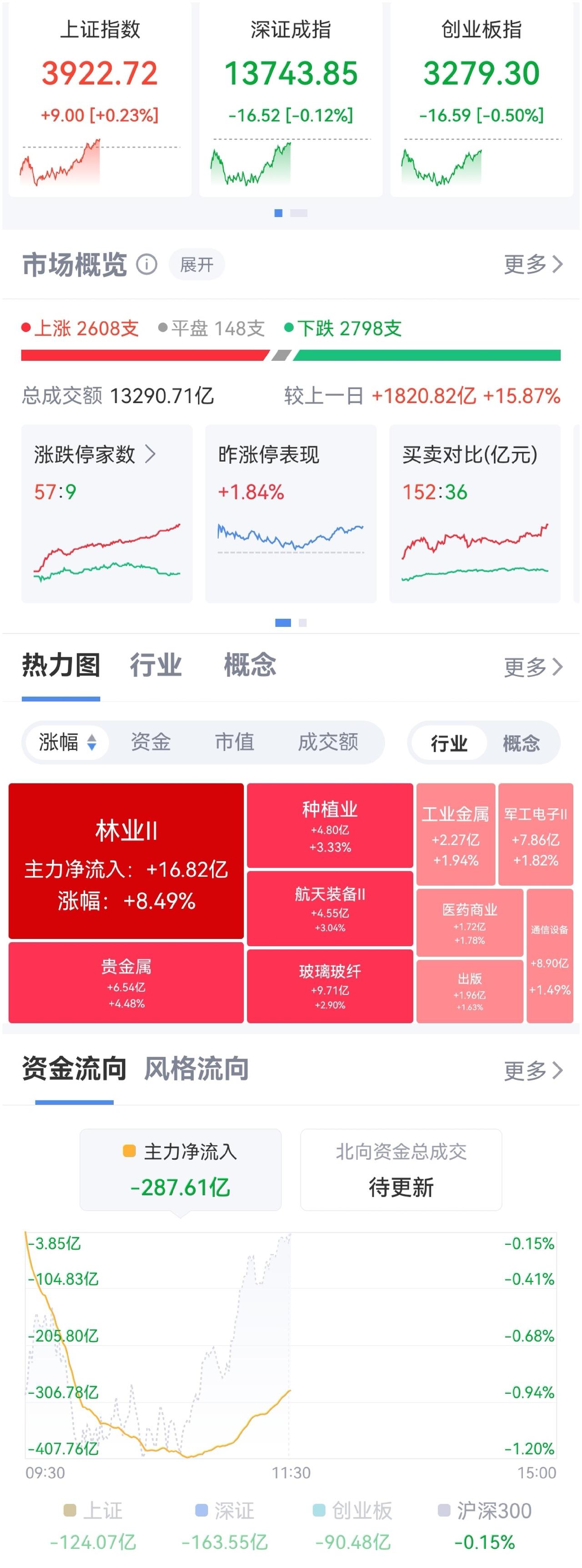资金 -288 ( +5)亿,流出大增但午前回暖