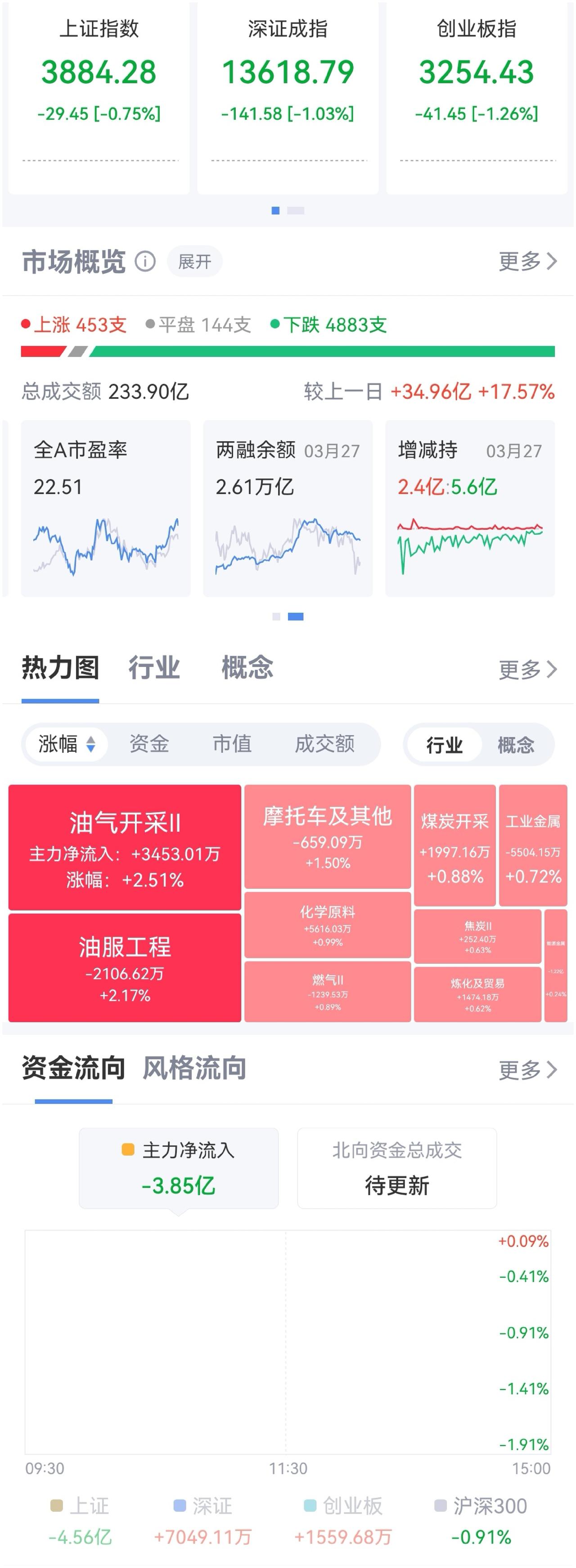开盘:沪-0.75%、深-1.03%、创-1.26%。
