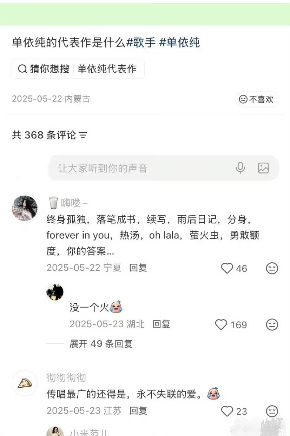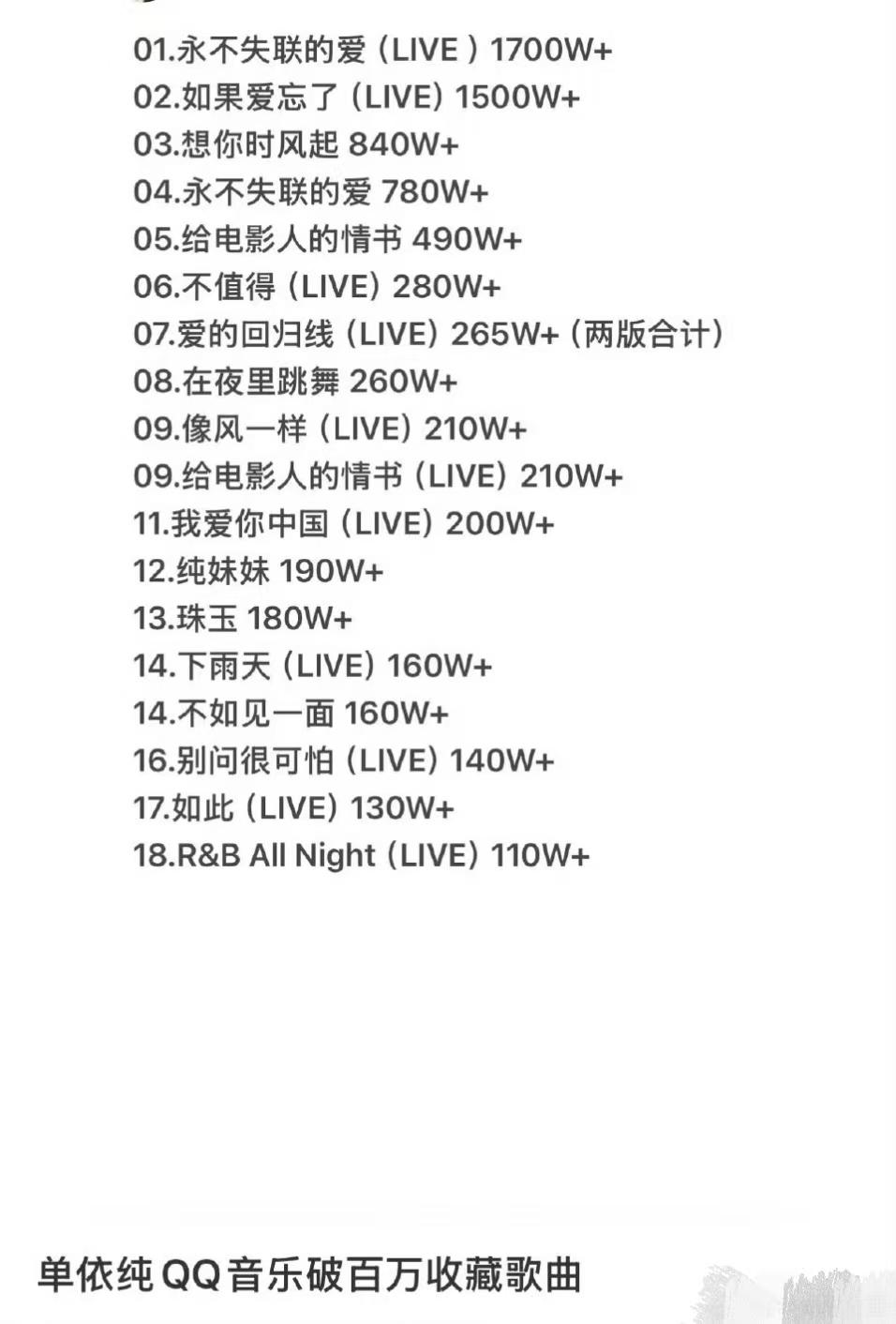 查了一下单依纯的歌单,此次演唱会有12首翻唱歌曲,网络平台收藏量最多的歌曲,大多也都是翻唱曲目。单依纯成名曲《永不失联的爱》原唱是周兴哲,她自己的原唱曲目有《终身孤独》、《落笔成书》、《续写》、《雨后日记》、《oh lala》、《萤火虫》、《勇敢额度》等等。 作为路人,想请教一下大家,单依纯这些原唱歌曲传唱度如何?像她这样的歌手,算得上华语乐坛顶流女歌手吗?