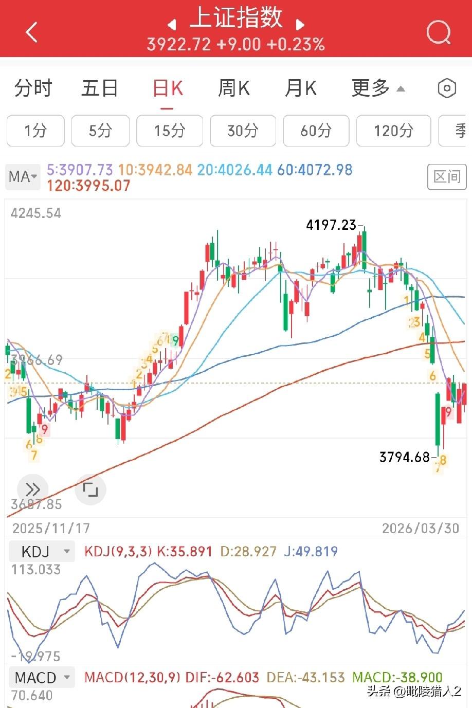 3月30日午评。两市上午涨跌不一,沪强深弱,成交量放出了1800亿(图1)。今日A股之盘面,较欧美市场强出许多。从120分钟及以下短周期看,目前似乎在构筑一个3850点~3950点的底部结构。