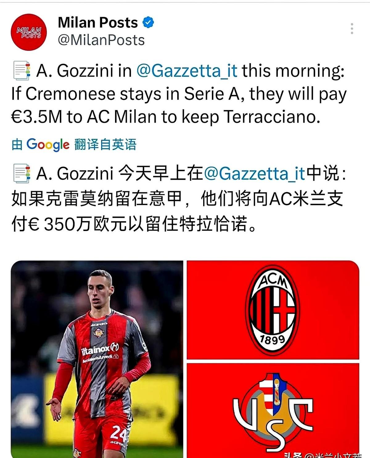 泰拉恰诺大概率要回米兰了!克雷莫纳保级悬了,那350万欧的买断条款也基本泡汤。 这小伙在克雷莫纳踢得挺拼,出场28-29次,还进了2个球。防守数据也亮眼,可惜球队整体拉胯,现在意甲排名17位,保级压力山大。 米兰这边,下赛季多线作战,正缺人手。泰拉恰诺是意大利本土球员,能踢边路也能打中场,正好符合欧冠报名要求。阿莱格里估计会把他当个重要替补。 毕竟米兰现在后防线稳得一批,意甲丢球最少,但中场深度还得补。泰拉恰诺回来,能提供不少防守硬度和灵活性。 大家觉得他能抓住机会,在米兰站稳脚跟吗?