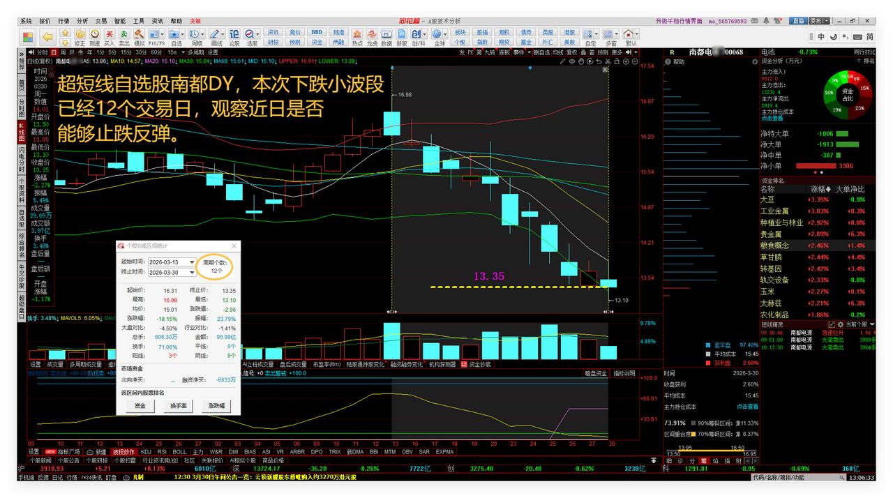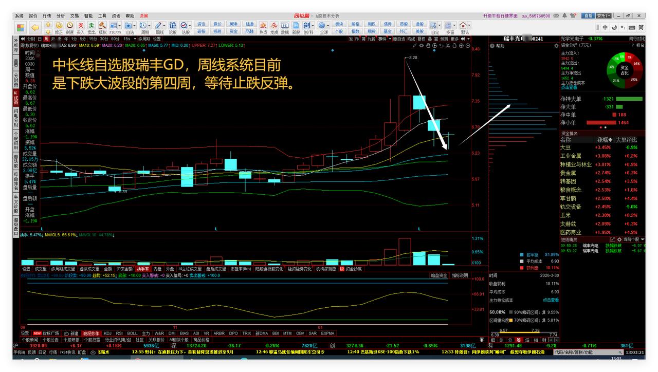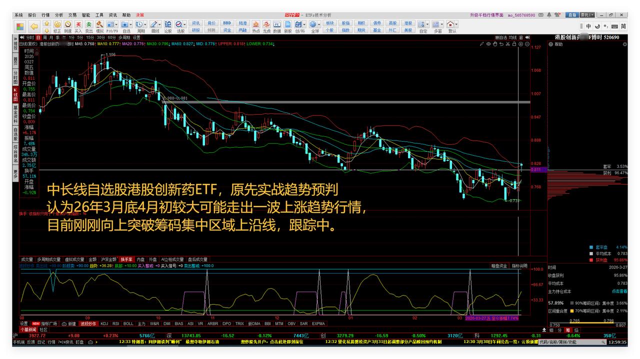 2026年4月3日清明前,大盘多空3855点,继续看反弹修复。目标先看10日线,再看20日线。敬请参阅附图1。 中长线自选股港股创新药ETF,原先实战趋势预判认为26年3月底4月初较大可能走出一波上涨趋势行情,目前刚刚向上突破筹码集中区域上沿线,跟踪中。敬请参阅附图2。 中长线自选股瑞丰GD,周线系统目前是下跌大波段的第四周,等待止跌反弹。敬请参阅附图3。 超短线自选股南都DY,本次下跌小波段已经12个交易日,观察近日是否能够止跌反弹。敬请参阅附图4。 老铁们下期再见点赞发财。