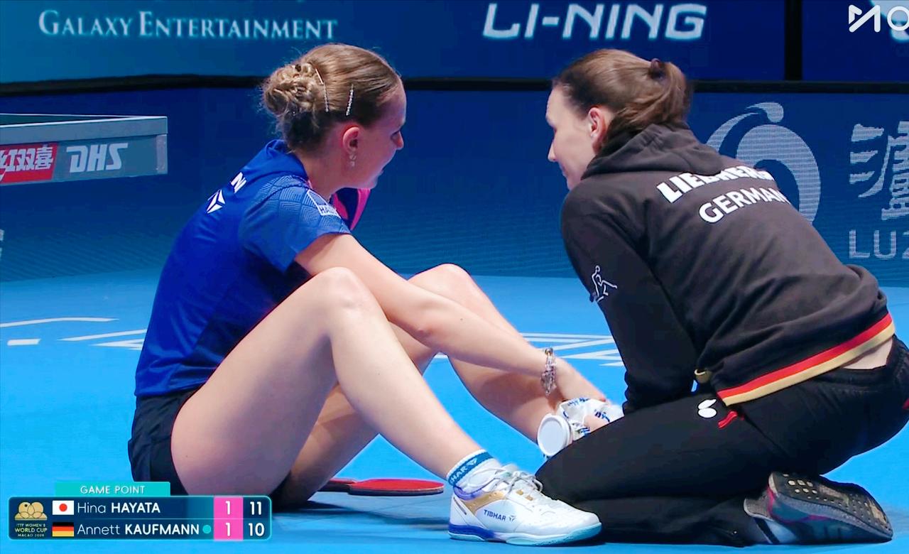 我去!这次世界杯地胶有些滑吗? 怎么意外频发! 孙颖莎、王曼昱一定注意了。 今天考夫曼和早田希娜的比赛中, 前两局 两人1:1平, 第三局 两人又打成了10:10, 此时意外发生了。 考夫曼为了救球, 受伤了, 疼哭了。 经过短暂治疗, 考夫曼坚持打完。 在第四局的时候, 早田又晃了一下, 差点拉伤。 莎莎和鳗鱼一定注意, 要健康完赛。