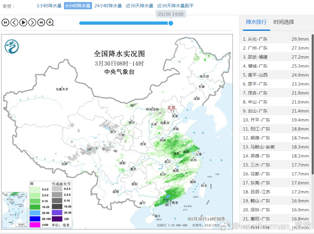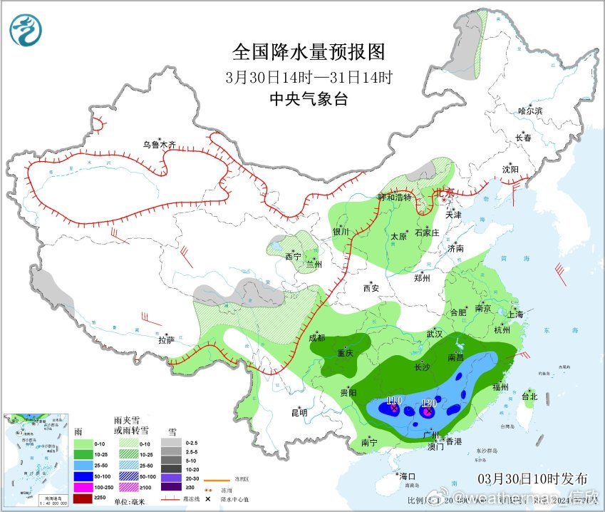 预计,3月30日14时至31日14时,广西北部和东部、广东中北部、湖南南部、江西南部和东部、福建西部、浙江西南部等地部分地区有大到暴雨,其中,广西东北部、广东北部等地部分地区有大暴雨(100~120毫米)。