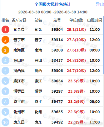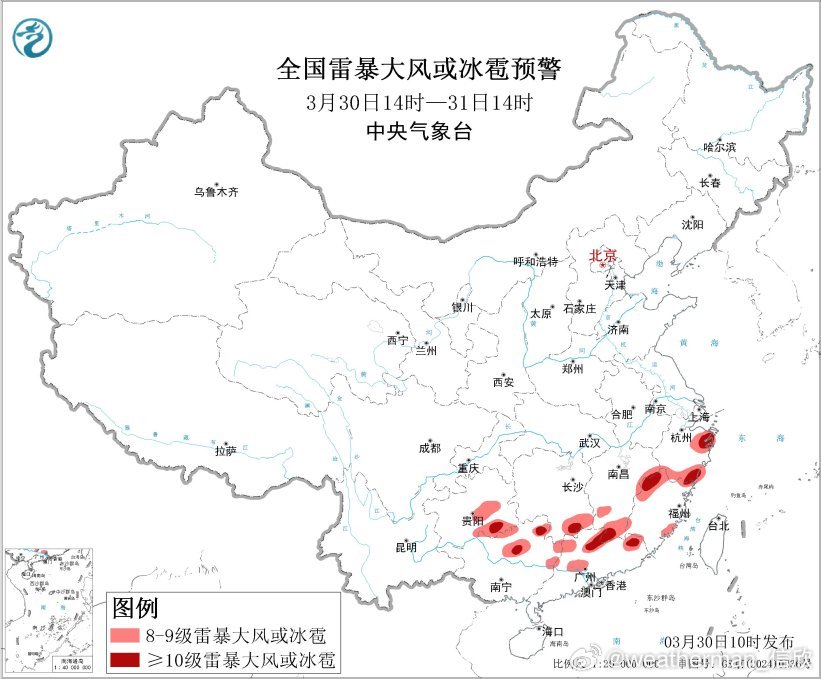 预计3月30日14时至31日14时,西南地区东部、江南东部和南部、华南中北部等地的部分地区将有8级以上雷暴大风或冰雹天气,其中,湖南南部、江西南部、浙江北部和南部、福建北部、贵州东南部、广西北部、广东北部等地的部分地区将有10级以上雷暴大风,最大风力可达11级以上;