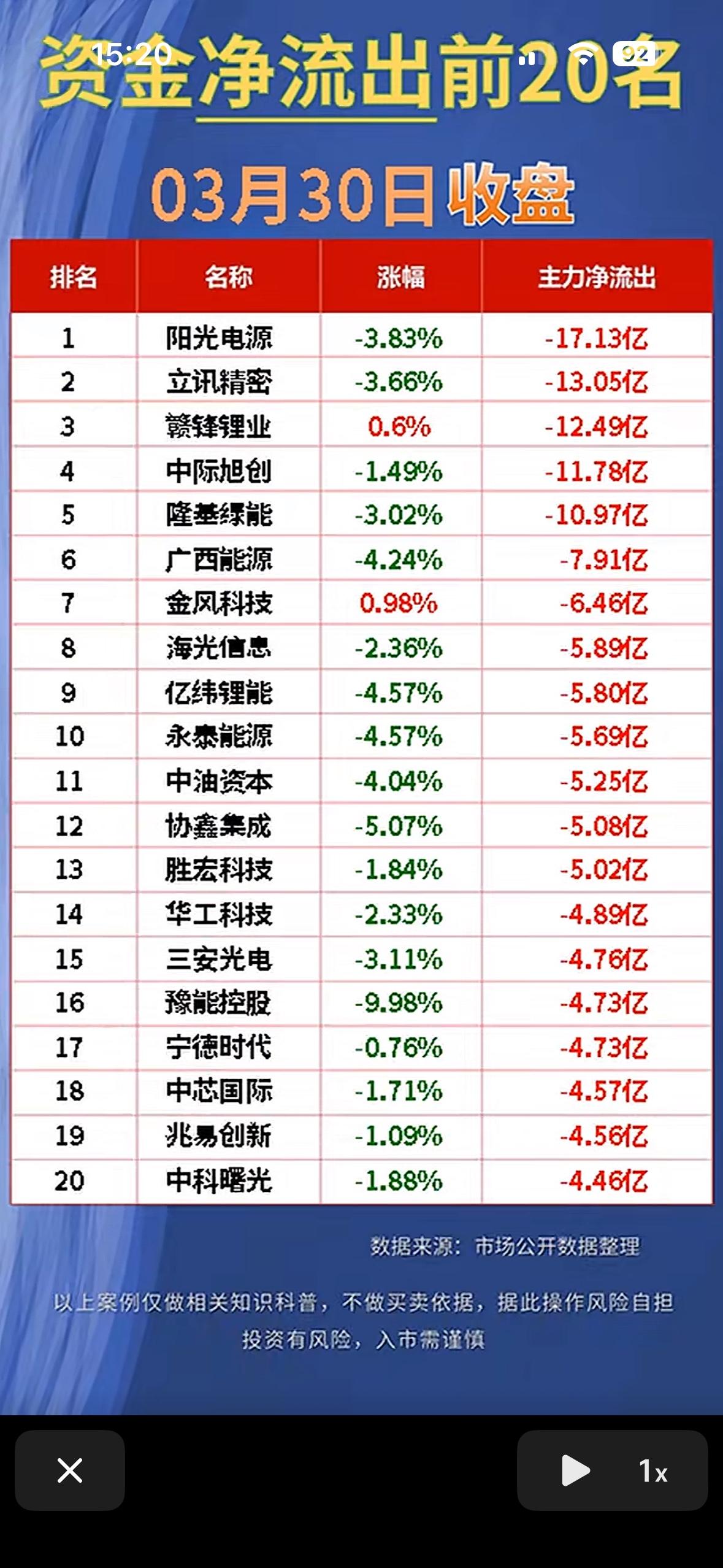 3月30日主力抢筹与出逃前20名个股揭晓 3月30日资金大迁徙:谁在狂买?谁在“撤退”? 主力资金“用脚投票”,市场风向一夜生变!3月30日收盘,资金净流入前20名与净流出前20名榜单揭晓,科技成长与新能源赛道上演“冰火两重天”——一边是AI算力、卫星导航、军工龙头被主力“抢筹”超百亿,另一边是光伏、锂电、消费电子龙头遭抛售超百亿。这场资金大迁徙,暗藏哪些信号? 一、资金“抢筹”榜:科技+军工成“吸金王” 平潭发展(+17.89亿):林业+新能源概念,主力净流入居首,或受益于碳中和政策催化。 亨通光电(+9.36亿):光纤光缆龙头,叠加AI算力需求爆发,光模块、海缆订单持续放量。 永鼎股份(+7.47亿):光通信+超导概念,空芯光纤、高温超导材料技术突破,主力资金提前埋伏。 中利集团(+6.21亿):光伏+储能双轮驱动,分布式光伏项目加速落地,业绩拐点预期强。 航天动力(+6.05亿):航天军工龙头,液体火箭发动机核心供应商,受益于商业航天政策红利。 光迅科技(+6.05亿):光模块+芯片双龙头,1.6T光模块研发领先,AI算力基建核心标的。 云赛智联(+5.99亿):国产算力+智慧城市,华为鲲鹏生态核心合作伙伴,数据要素政策利好。 烽火通信(+5.30亿):光通信全产业链龙头,央企背景,5G基建与算力网络双轮驱动。 福晶科技(+5.05亿):激光晶体+光通信,LBO晶体全球市占率超80%,AI激光雷达需求爆发。 宏和科技(+4.93亿):电子级玻璃纤维布龙头,覆铜板上游核心材料,受益于PCB行业复苏。 二、资金“出逃”榜:新能源赛道“失血”严重 阳光电源(-17.13亿):光伏逆变器龙头,主力净流出居首,或因光伏行业产能过剩、价格战担忧。 立讯精密(-13.05亿):消费电子+果链龙头,苹果产业链需求疲软,业绩增速放缓引发资金避险。 赣锋锂业(-12.49亿):锂电龙头,碳酸锂价格持续下跌,上游资源端盈利承压。 中际旭创(-11.78亿):光模块龙头,前期涨幅过大,主力资金获利了结。 隆基绿能(-10.97亿):光伏组件龙头,行业竞争加剧,毛利率下滑预期压制估值。 广西能源(-7.91亿)、金风科技(-6.46亿)、海光信息(-5.89亿)、亿纬锂能(-5.80亿)、永泰能源(-5.69亿):能源、锂电、芯片赛道集体遭抛售,资金避险情绪浓厚。 三、资金动向背后:三大逻辑浮出水面 1. 科技成长主线强化:AI算力、卫星导航、军工、光通信等赛道获主力资金持续加仓,政策支持+技术迭代双轮驱动。 2. 新能源赛道“去泡沫”:光伏、锂电、风电等前期热门赛道遭资金大幅流出,行业产能过剩、盈利下滑担忧升温。 3. 业绩与估值的“再平衡”:主力资金从高估值、业绩不确定的标的中撤退,转向业绩确定性强、政策支持明确的科技成长龙头。 四、风险提示 资金流向仅为短期市场行为,不代表长期趋势。投资需结合公司基本面、行业政策、估值水平综合判断,切勿盲目跟风。 结语:资金“抢筹”与“出逃”的背后,是市场对“科技成长”与“传统赛道”的重新定价。下一个风口,或许就藏在这些资金动向的细节里。