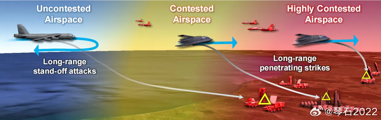 美军6代机穿透作战2026年2月23日,B21诺格公司又获得了提前拨付的45亿美元经费用于提升研发生产速度,结合之前20亿采购和32亿研发经费,B21项目合计经费已达100亿美元,确保其在2027年服役。美空军称F47第六代战机也有望在2028年首飞。美空天军协会智库发布报告指出美空军需要至少采购200架B21和300架F47图3,才能在未来可能爆发的大规模冲突中占据上风。很长一段时间美军过度依赖防区外打击手段,但效率却相对低下,不仅杀伤链在对手干扰下极为脆弱,且防区外武器在射程、毁伤效能、时效性等方面均可能无法满足实战需求,成本效益也不理想。面对未来强对抗A2/AD拒止环境与纵深打击的任务要求,美空军战略必须实现转型与升级——核心是在拒止环境中实施高效的穿透式作战。为此提出了“分散式协作空中作战”DCAO这一新型作战概念。DCAO概念的作战理念聚焦于“效果导向”图4,即通过精准打击敌方纵深的高价值目标,快速达成战略或战役效果,利用先进穿透平台的信息优势,识别并攻击敌方作战体系中的多个关键依赖性与脆弱节点,以引发其系统性瘫痪。多个分散的DCAO穿透式编队可同步展开平行作战图5,在不同区域分别执行制空、对地打击、电子攻击等任务,形成多轴压力。此外,DCAO穿透式编队并非孤立作战,已穿透的先进战机可作为前方指挥节点,引导处于“外线”的防区外非隐身平台发射远程精确打击武器,或配合执行协同电子战,从而将穿透式打击的效能辐射至整个作战体系。B21轰炸机或可作为战略级穿透节点,承担电磁频谱域压制欺骗,情报数据处理中继,战术边缘算力支撑,决策指令生成分发等指挥控制职责,在断网环境下领导DCAO穿透式编队执行窥探侦察、滋扰掩护、电磁压制、火力吸引、要域破击等任务,达到内、外线部队“系统簇”联合夺取多域制权的作战效果。◆美军这种战略规划,与我们《未来空战全域火力场研究》有异曲同工之妙。与美军不同的是,美军组合是B21+F47+F35,而我们是J36+马兰系列,很明显,美军F35撑不起来穿透作战的需求,B21与J36对比,美军自二战以来第一次在战机技术方面已经落后于我们!