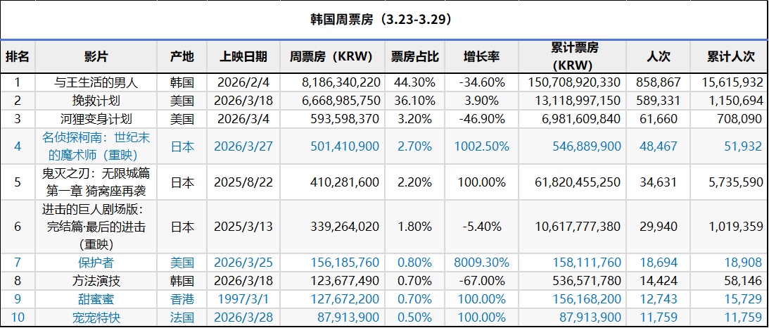 2026年第13周韩国票房 :1.《与王生活的男人》稳居冠军,累计观影人次1561万;2.《挽救计划》观影人次破百万;3.《名侦探柯南:世纪末的魔术师》在韩重映表现不错;4.香港电影《甜蜜蜜》上榜。(数据:韩国电影振兴委员会)
