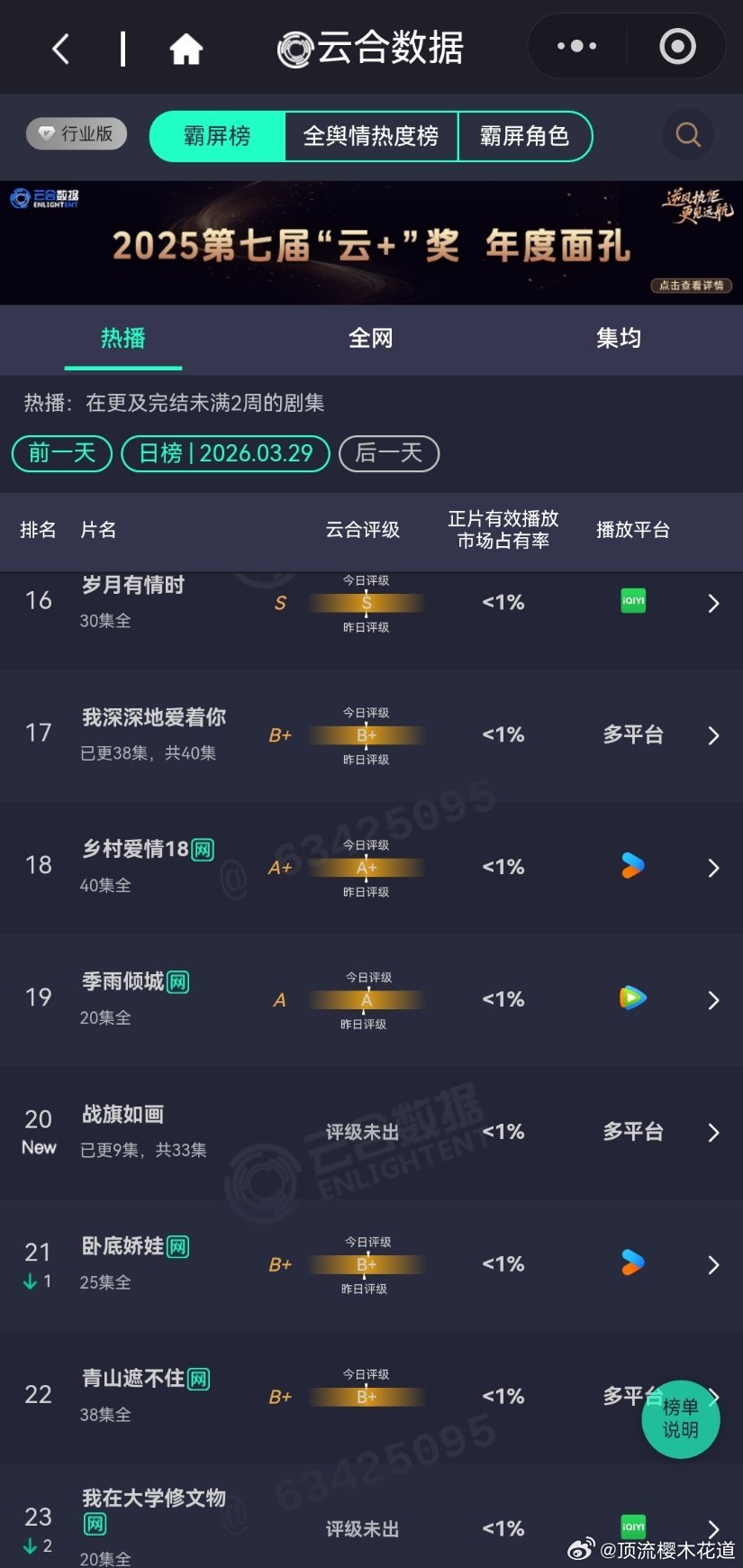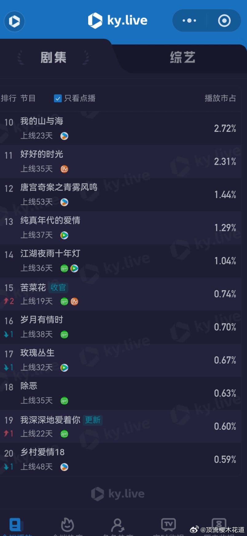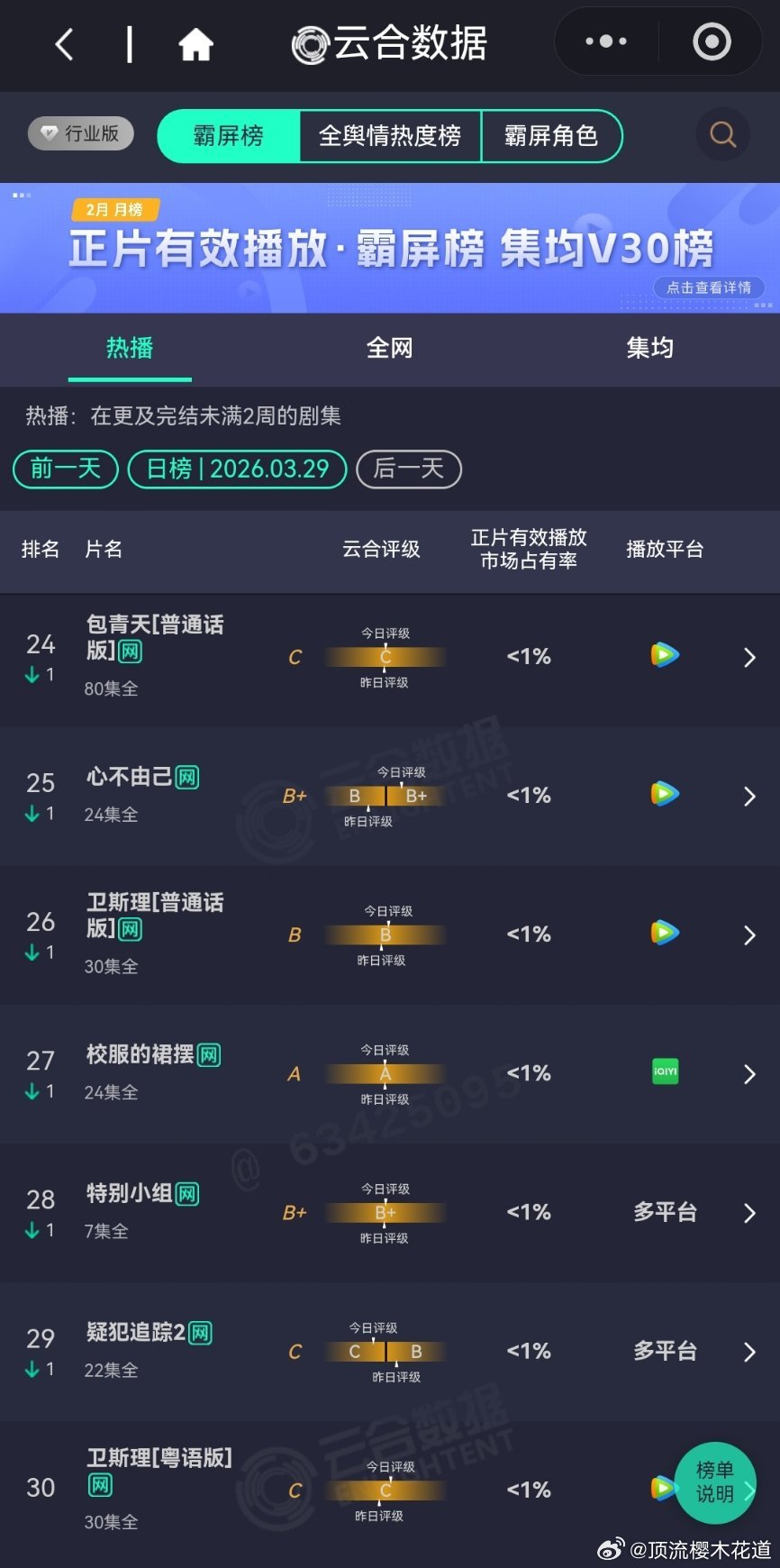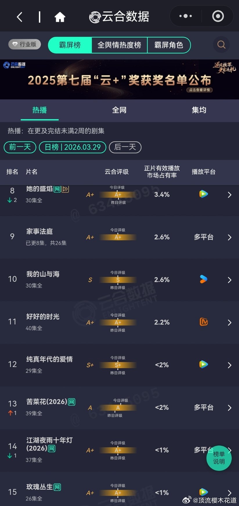 3月29日云合播放占比云合 VS酷云逐玉云合41.5%,酷云39.98%白日提灯云合9.3%,酷云11.53%翻倍失败了,横盘趋势你是迟来的欢喜云合4.4%,酷云3.91%家事法庭云合2.6%,酷云2.9%