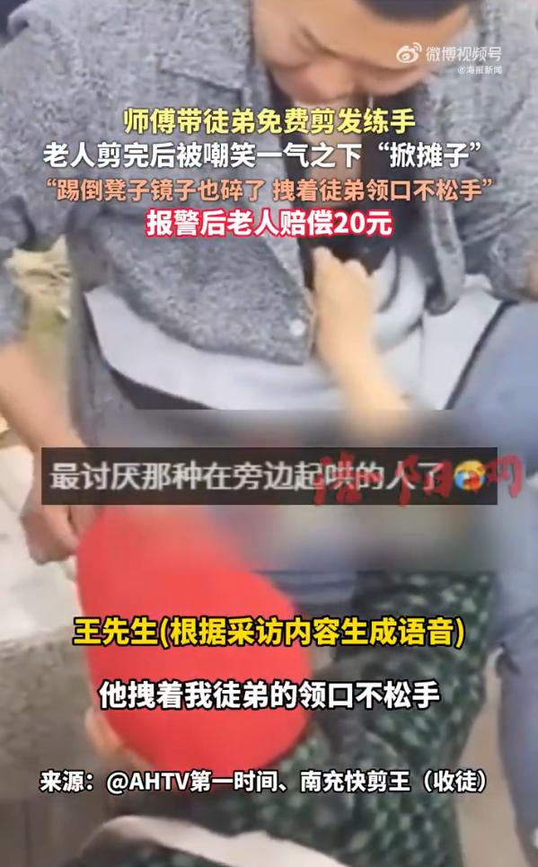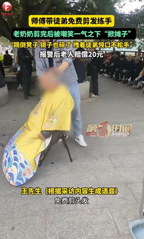 免费的活也不好干!四川南充,一男子带着徒弟到公园摆摊,免费让徒弟给人剪发练手,没想到,一位老太太剪完后被旁边的人嘲笑剪的丑,老太太直接把摊给砸了,最后报了警,赔了20块钱 王师傅是个理发师,带着徒弟在公园摆了个摊,本意是让徒弟练练手,剪头发不要钱。剪之前还把话说在前头,告诉来的人,是学徒剪,不收费,自己在一旁盯着。这样的好事,不少大爷大妈都乐意试试 轮到一位老太太,徒弟认认真真给剪完,王师傅还上手帮忙修了修,按理说也算圆满 可旁边有人笑了一声,说剪得不好看。老太太顿时脸上挂不住,火气蹭地上来,一脚踢翻了凳子,摔了镜子,还揪着徒弟领口不松手 最后闹到报了警,老太太怕给自己儿子添麻烦,赔了20块钱镜子钱 说实话,这个事不算大,但还是让人心里有些不是滋味 免费的东西,往往反而让人觉得理所当然。徒弟练手是事实,师傅也提前说清楚了,可当周围人的一句闲话戳中了面子,所有事先的约定都变得不算数。老太太发火,或许不全是因为发型,更多是因为被人笑了,觉得自己在熟人面前丢了脸 这让我想起一句话:施恩不图报是美德,但施恩的人也要想清楚,你给的东西,对方是不是真能接得住。免费的背后,是期待对方理解、包容,可现实中,很多人恰恰是在免费的事情上,最不愿意包容 老太太赔了20块钱,看起来是给这件事画上了句号。但这场风波里,没有赢家。徒弟受了惊吓,王师傅摊子被砸,老太太丢了面子又赔了钱。免费的东西,最后谁都没占到便宜