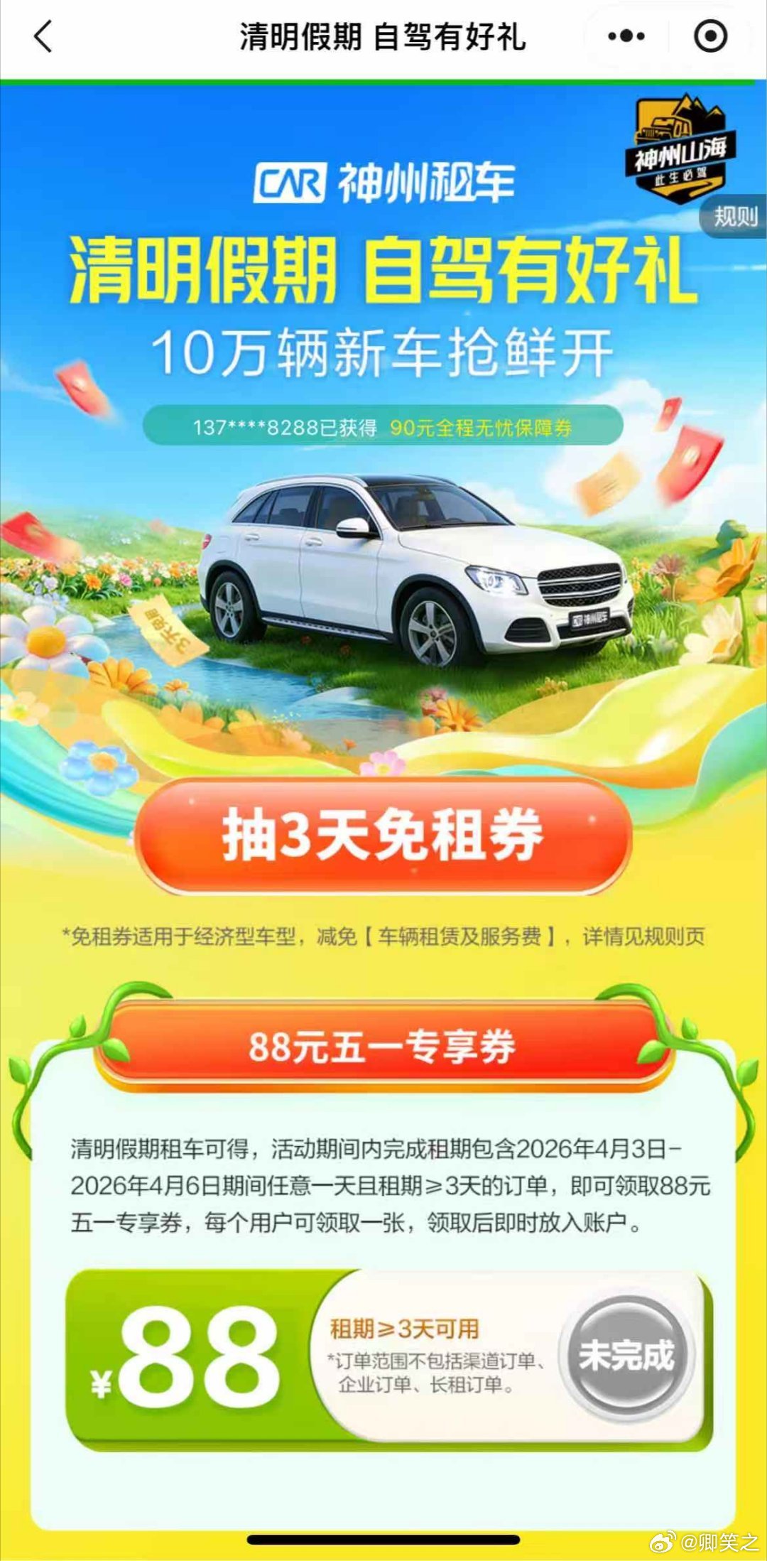 当我决定假期不再待在家 厌倦了不变的窗外风景?方向盘在手,山海我有。清明租神州,踏青赏春色,即刻解锁88元五一租车券。一路驰骋,把春天和下一次旅程的优惠,统统装进后备箱。神州山海 此生必驾神州春游季神州租车