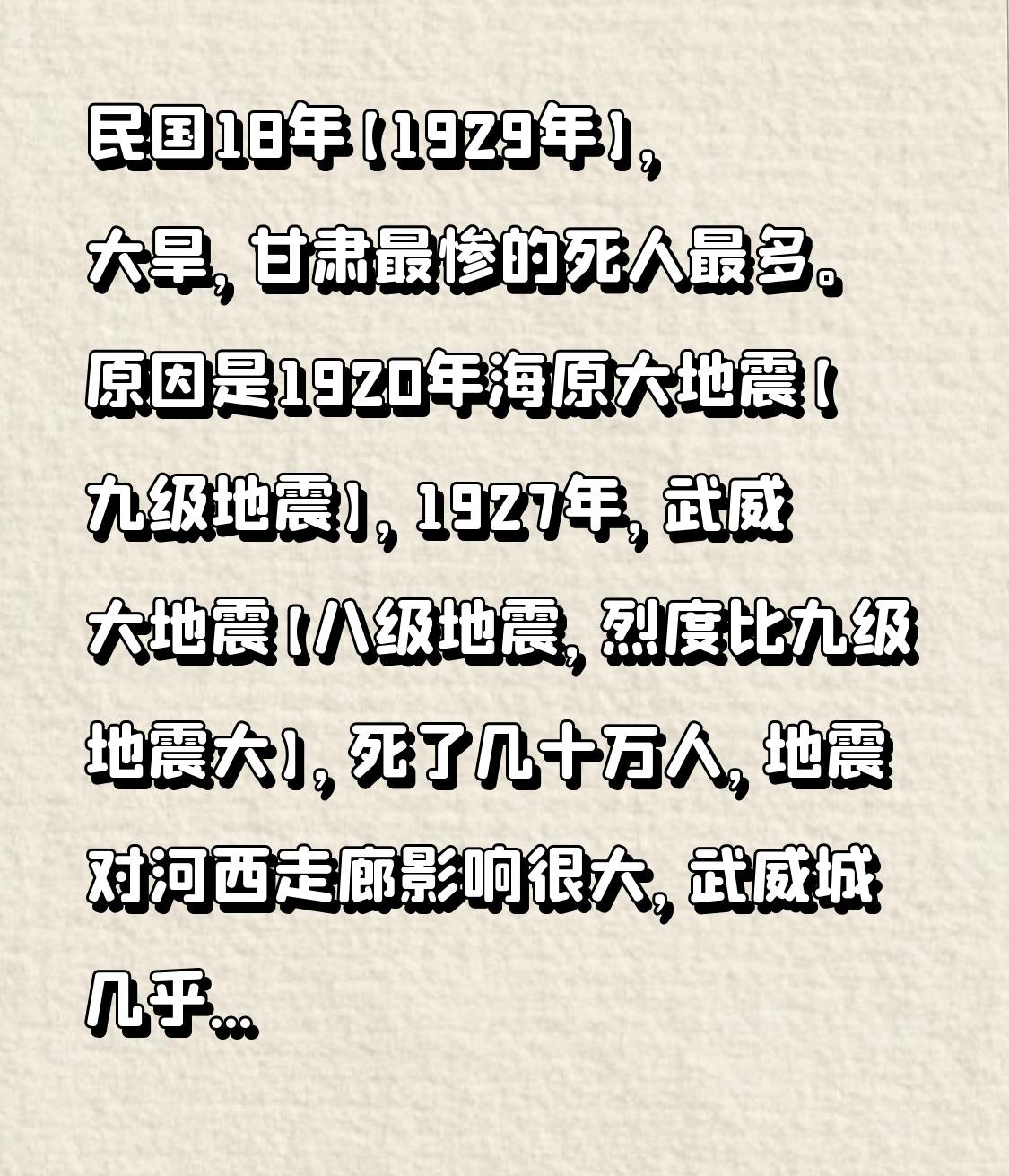 民国18年【1929年】,大旱,甘肃最惨的死人最多。 原因是1920年海原大地震【九级地震】,1927年,武威大地震【八级地震,烈度比九级地震大】,死了几十万人,地震对河西走廊影响很大,武威城几乎夷为平地。人口死伤惨重。 接下来1929特大旱灾,尸横遍野,人吃人, 10年内,甘肃省遭遇三次特大天灾。 1920年,海原大地震,死亡30万左右。 1927年,武威大地震,死亡20万左右。 1929年,民国18年特大旱,死亡400万左右。