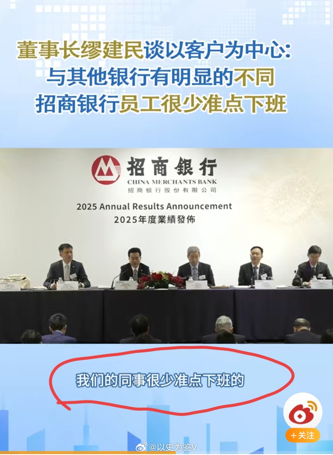 招商银行董事长称员工很少准时下班看大家都在吐槽招商银行把加班当荣耀,加班当然不对