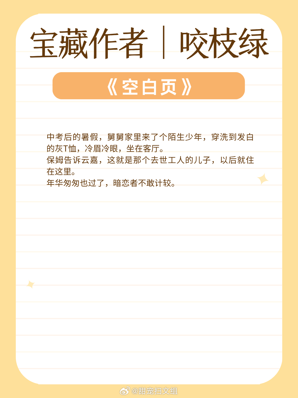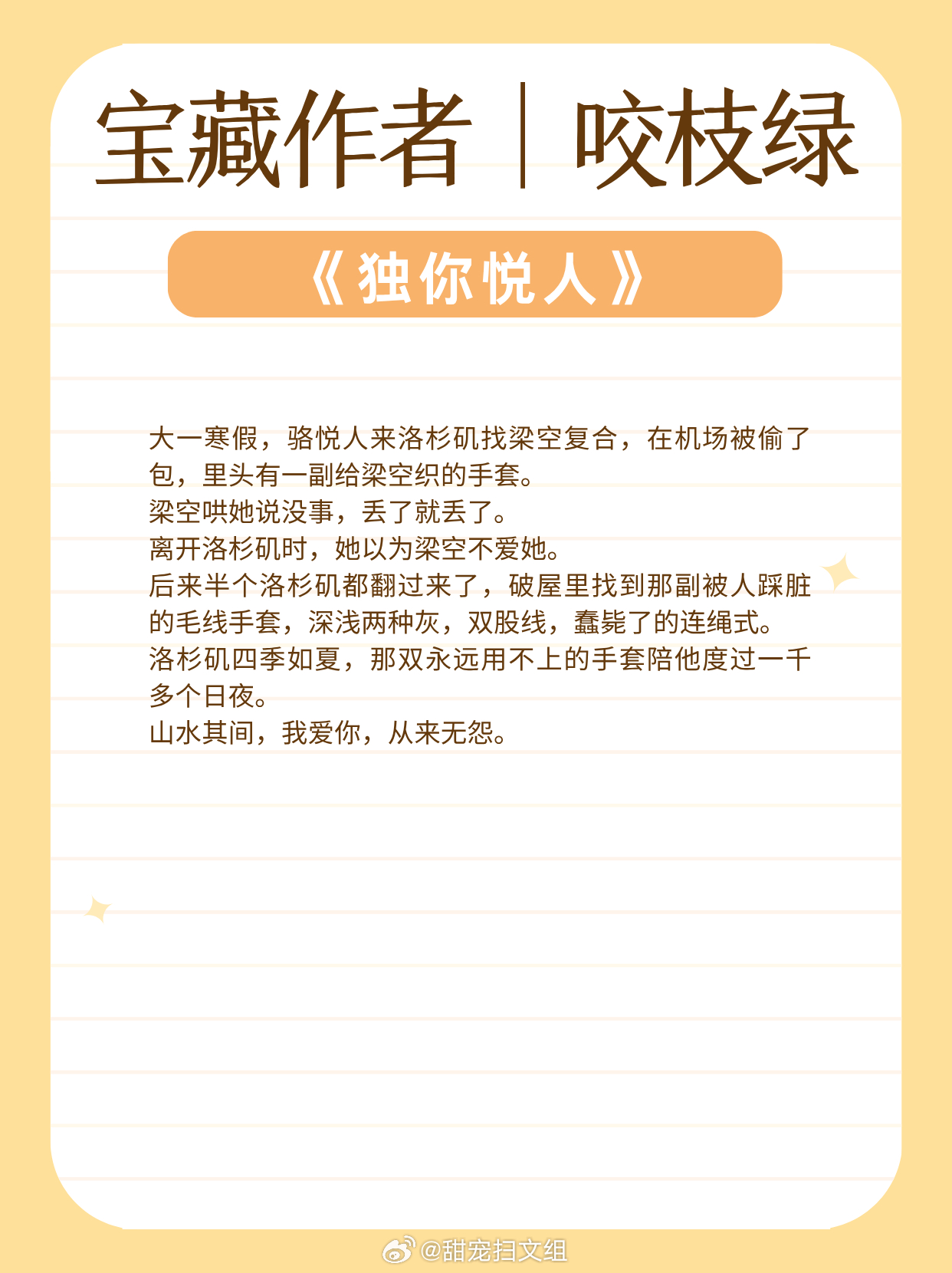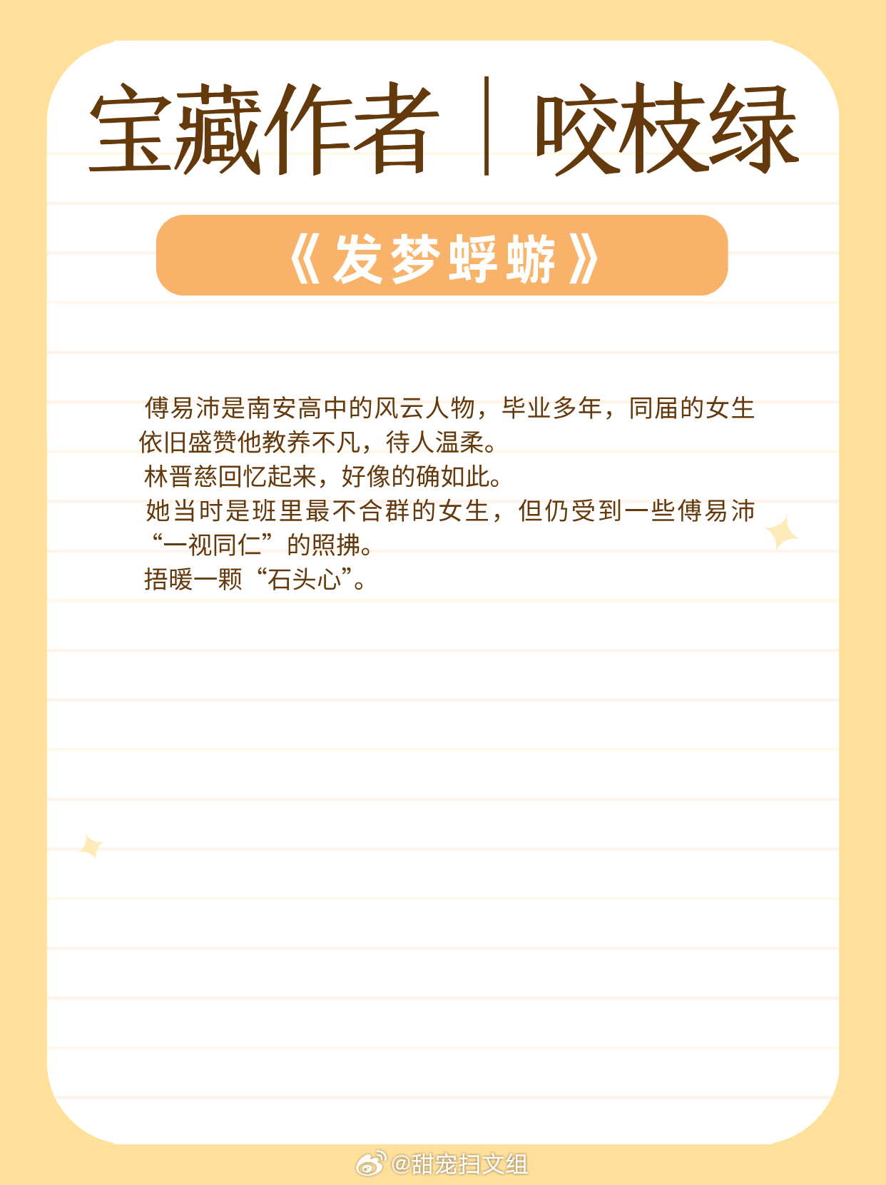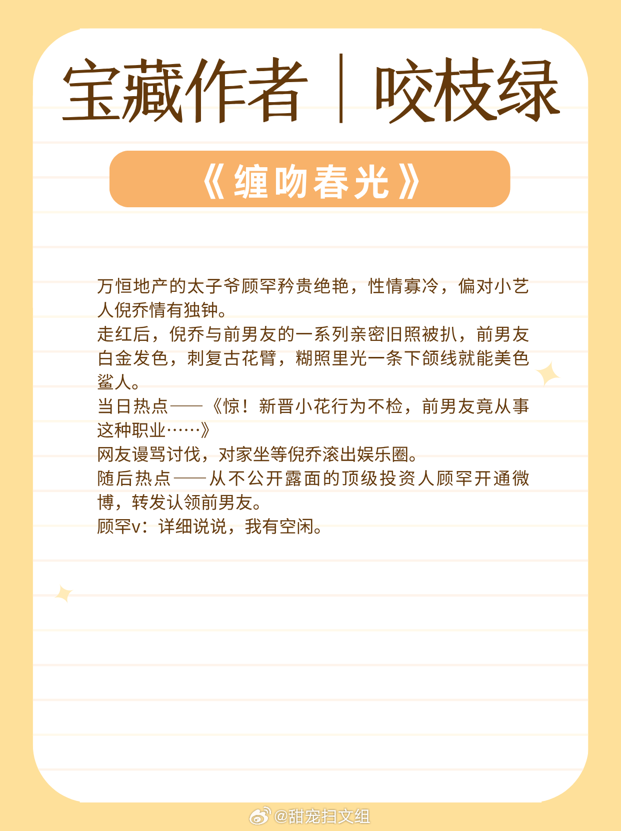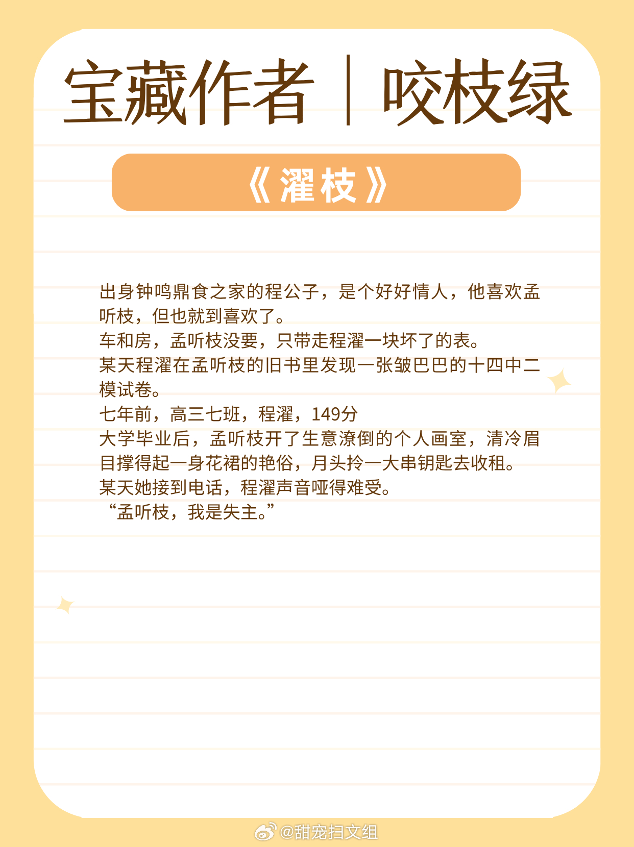 宝藏作者|咬枝绿:擅写都市言情!文风细腻动人!娇气单纯小公主vs风流爹系大少爷:《濯枝》清冷白月光vs深情公子哥:《独你悦人》咸鱼清冷美人 vs 温柔深情兵哥哥:《发梦蜉蝣》温柔通透大小姐vs隐忍深情穷小子:《空白页》眼瞎小甜豆vs傲娇前男友:《缠吻春光》古镇少年vs娇纵明星:《返场热恋》让我吹爆的宝藏小说 兜兜转转还是这些小说好看