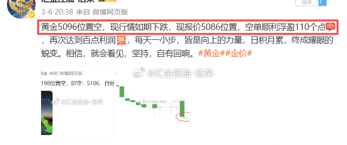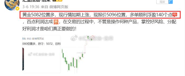 2026.3.6日博文公布5单,全胜!共收割1180点利润。做交易,不求一夜暴富,找对方向,跟对人做对事,能够保持稳定持续盈利就好,资金当然也会积少成多,毕竟投资讲究的是细水长流。黄金 金价