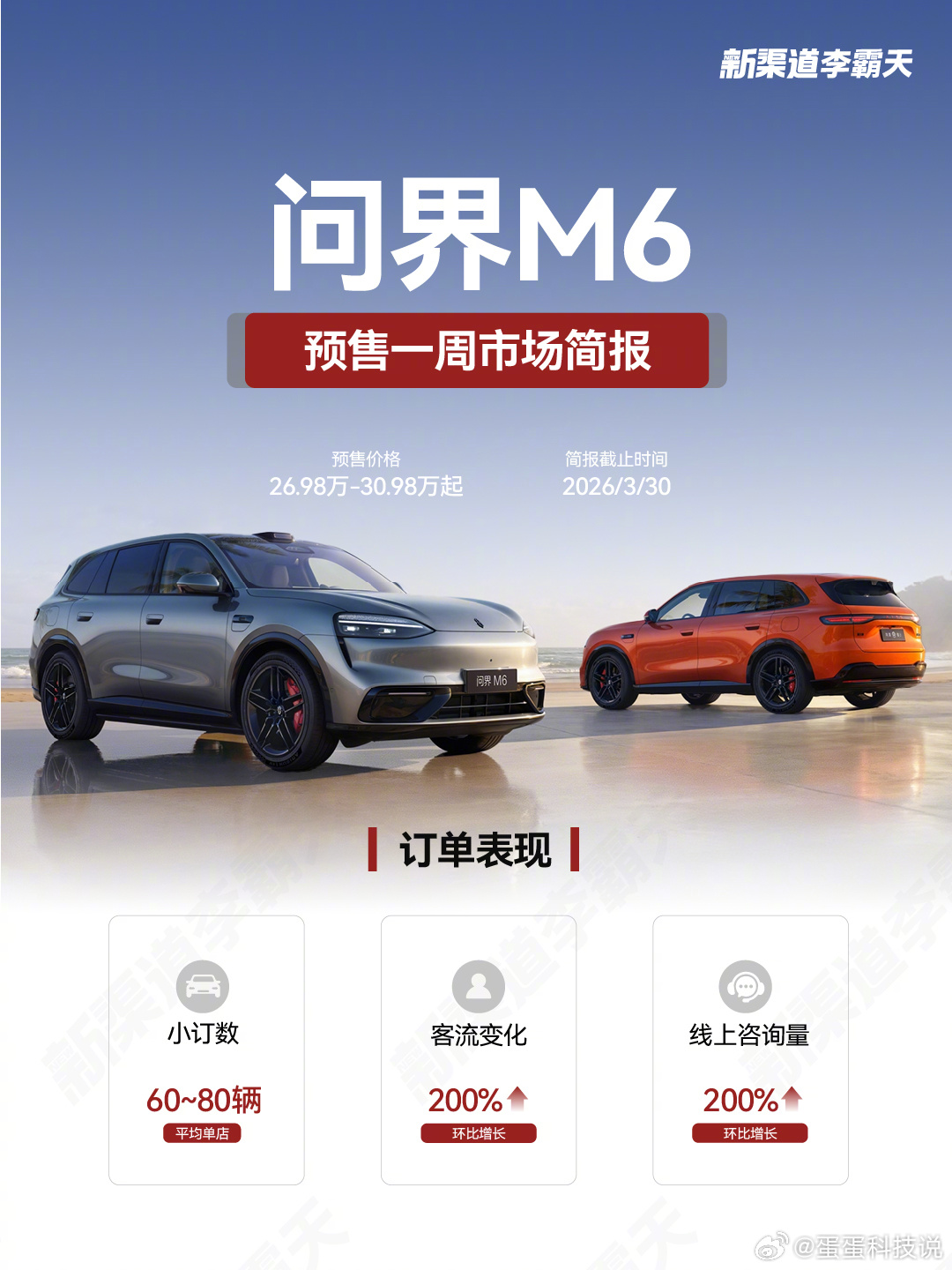 问界M6这次预售真的有点东西,数据一出来就很能打!单店小订直接干到60-80台,放在现在的市场环境里,这个成绩已经非常不错了。更让人意外的是用户人群,将近七成都是90后,直接把问界这个牌子带得越来越年轻。 另外女性用户也超过三成,多半是单身或者年轻无孩家庭,看得出来M6这次是真的精准戳中了年轻人,成功打入年轻市场。问界M6小订纯电版订单近五成问界M6近七成小订用户为90后