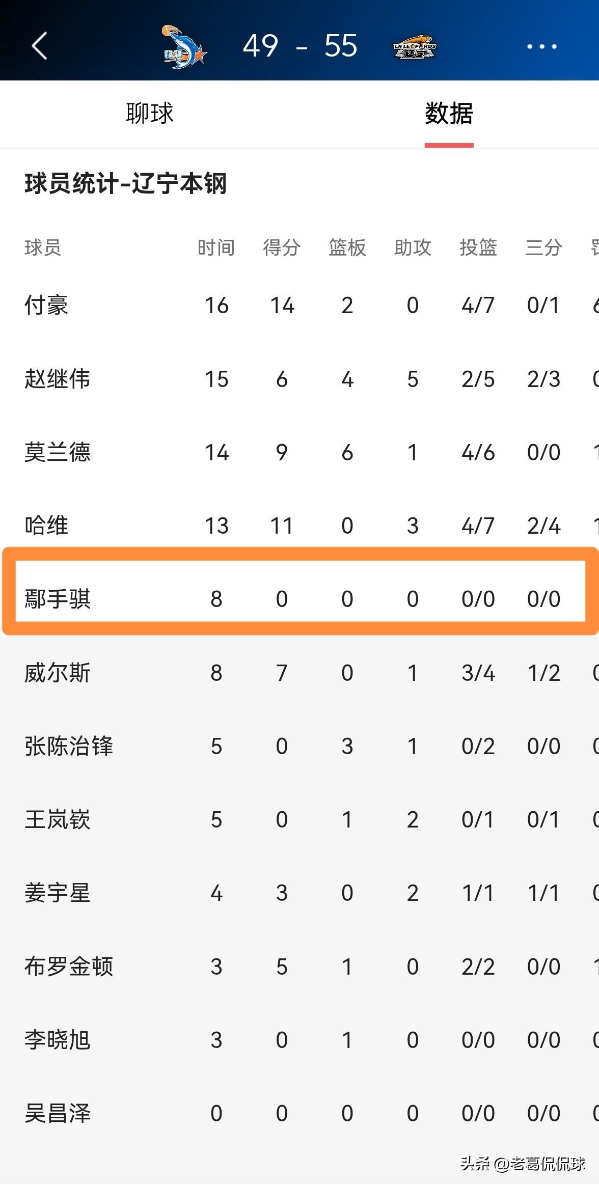 辽宁本钢大将鄢手骐真是太莫名其妙了!在今天辽宁本钢客场挑战福建晋江文旅的比赛中,目前两队的上半场比赛已经结束,辽宁本钢暂时以55:49处于领先。让人感到非常奇怪的是,在前两节比赛中,鄢手骐在首发出战的8分钟里,竟然零出手怒砍0分0篮板0助攻0抢断,他的场上正负值为-1。 说实话,鄢手骐在上半场比赛中的表现确实太莫名其妙了,这样的鄢手骐真是太罕见了。