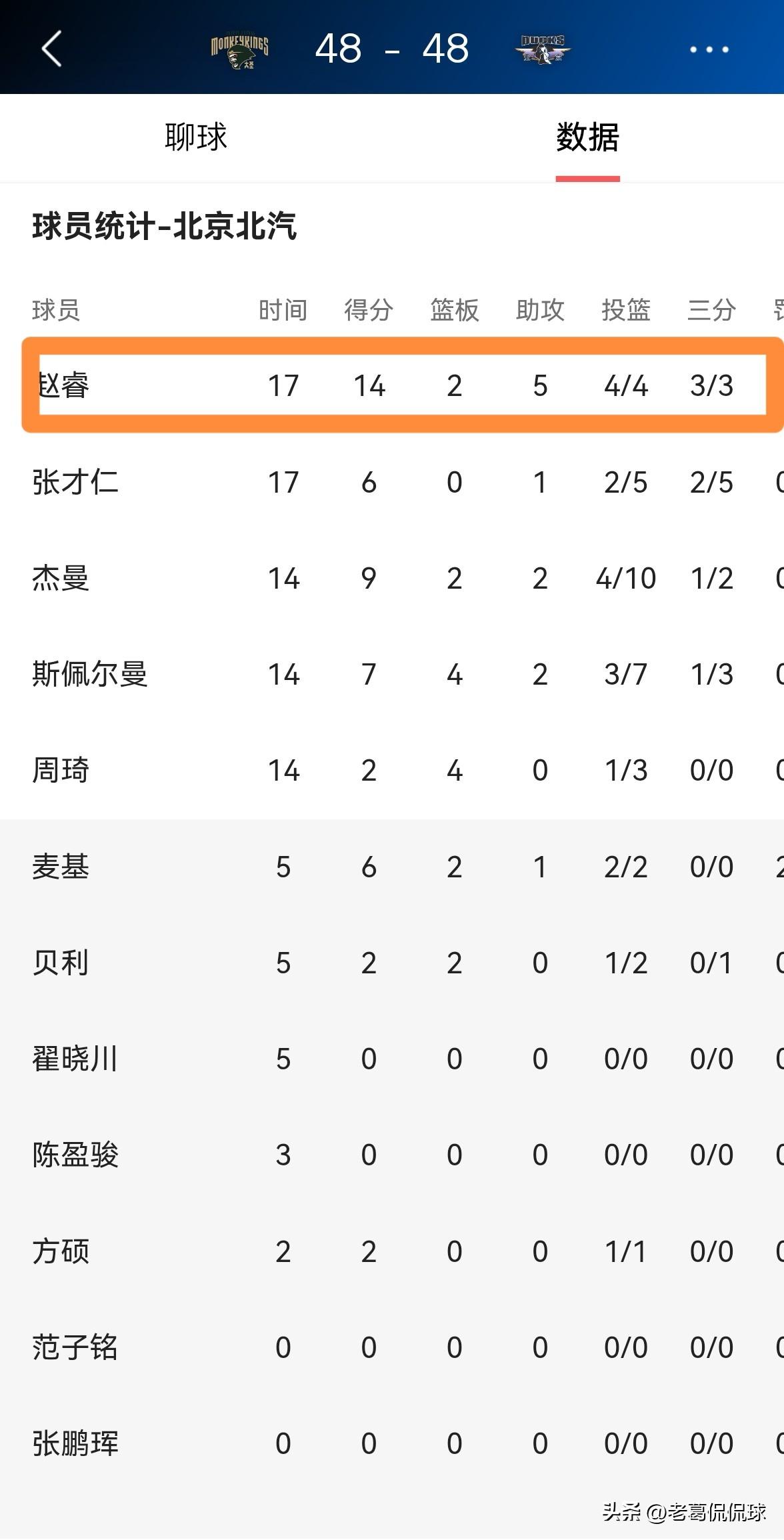 北京北汽巨星赵睿的进攻状态真是太火热了!在今天北京北汽客场挑战南京天之蓝的比赛中,目前双方半场战罢,两队战成了48平。在前两节比赛中,赵睿在进攻状态非常的火热,他在首发出战的17分钟里,投篮4中4,其中三分球3中3、罚球3中3极其高效的砍下14分,还有2篮板5助攻2抢断,他的场上正负值为全队最高的+7。 实事求是的说,只要赵睿能够在下半场比赛中延续自己的火热状态,那么北京北汽必胜无疑,不然的话北京北汽很有可能会在客场输给南京天之蓝。