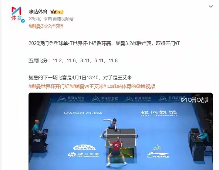 30日中午世界杯:国乒2连胜蒯曼3-2,日乒2胜1负,伊藤苦战5局!北京时间3月30日中午,澳门世界杯首个比赛日,蒯曼以3-2击败法国的卢茨,在大比分2-0领先的情况下,差点被逆转了,蒯曼的表现有起伏,还需要好好总结!蒯曼在下一轮的对手是美国球员王艾米,双方存在实力上的差距,预计将2战全胜晋级女单16强!国乒在首日已经取得2连胜,蒯曼和周启豪都顺利拿到小组赛第一轮的胜利!