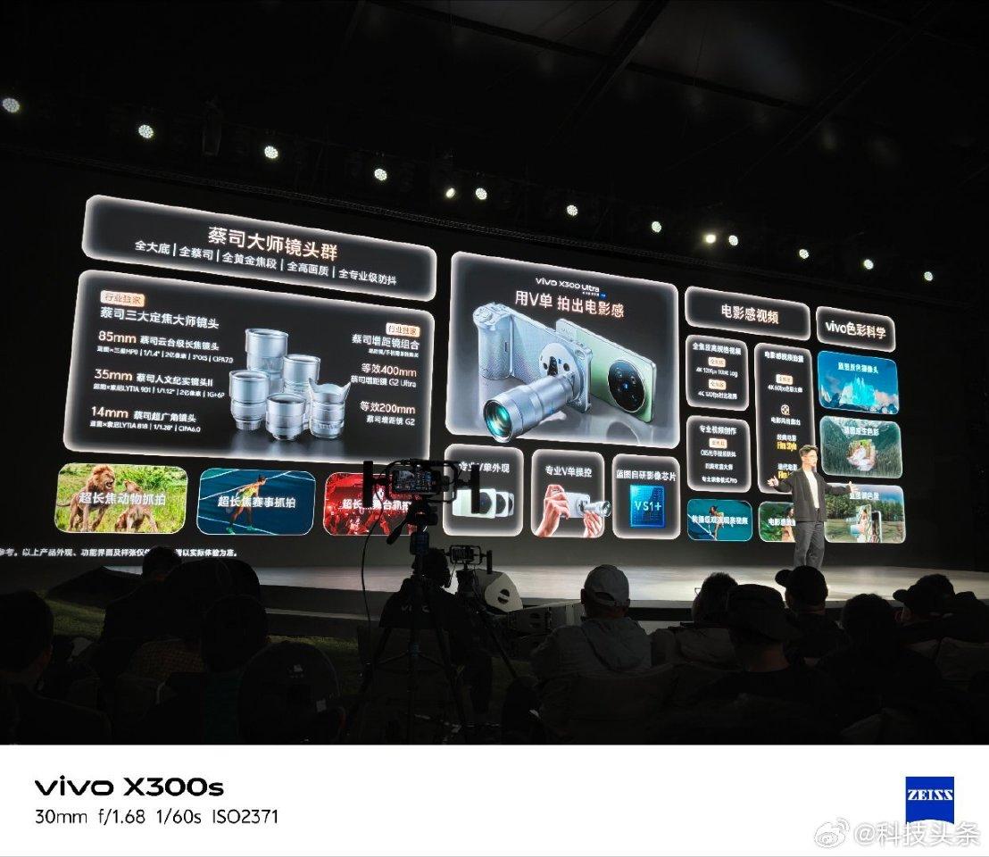 vivo X300 Ultra 专业V单/口袋摄影机 按照专业相机思路打造 影像新物种 拥有蔡司镜头群。 6999起,依旧送200GB云空间2年。 G2 Ultra 1499。 摄影师套装只要11999。 兔笼1699。 vivo X300 Ultra为那些爱生活 爱记录的人而生。 关键焦段 足够全、画质足够好。 赛博逗蛐蛐没意思,超长焦拍的好才更重要。 Ultra出街,你的专属OOTD。 视频规格天花板,400mm转播级视频录制。 带给你创作自由。 附配置: - 5代骁龙8至尊,6600毫安时电池+100W+40W。 - 京东方6.82英寸2K 144Hz 8T LTPO 2.5D直屏,3D超声波指纹。 - 前置 5000万 - 后置 主摄,2亿LYT901,1/1.12" F1.85 35mm 超广角,5000万 LYT818,1/1.28" F2.0 14mm CIPA 6.0 潜望式长焦,2亿 HP0,1/1.4" F2.67 85mm 支持长焦微距,超清60fps运动抓拍,3º光学防抖 CIPA 7.0 500万蓝图原色摄像头,12通道。 14-400mm全焦段2500万直出。 14-400mm全焦段高规格视频,全焦段OIS视频防抖,400mm也不抖。 全焦段4K 60fps色彩法师,八款胶片风格,支持调色盘。 电影风格直出。 自定义3D LUT导入监看。 4麦组合,可接领夹麦。 蓝图原生色彩,蓝图调色盘,拥有肖全大师/黑白配方。(X300s也支持) - 增距镜 200mm G2(约8.7x光学直出2亿 CIPA 6.5) 400mm G2 Ultra(约17.4倍光学直出2亿 CIPA 4.5) 照片、动态、人像、视频等全场景支持。 - 大师双扬 定制0.8cc 1697上扬声器,751440 X轴马达,IP68/IP69,1TB版本支持北斗卫星通信。 - 厚8.19mm