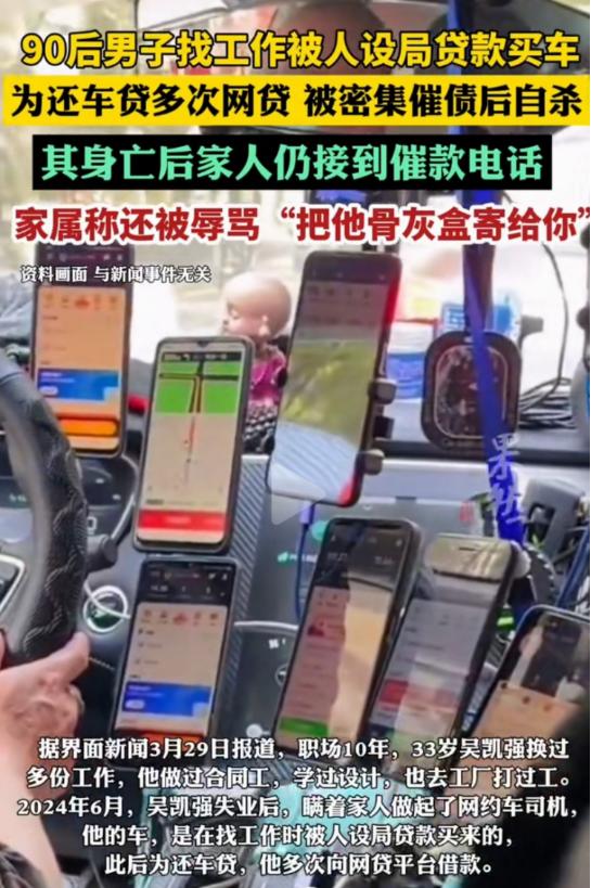 浙江东阳,33岁的男子,在母亲长眠的公墓旁,在车里结束了生命。而悲剧的开始,以为能找到月入过万的司机工作,不料,却掉进了“贷款买车”的陷阱,最终男子被无休止的催债,逼上了绝路。最让人难以接受的是,男子死后,家人还接到催收电话,被辱骂:“把他骨灰盒寄给你”。   “不还钱,就算死了也别想安宁!”电话那头,一个操着湖南口音的男声,语气恶毒的说出这句残忍的话。   此时距离吴凯强喝下农药、在母亲墓旁的车里割腕离世,刚刚过去五天。姐姐吴凯歌攥着手机,手指发抖,那一刻她才真正明白,弟弟生前到底在躲什么。   吴凯强33岁,浙江东阳人,职校毕业后换过几份工作,性格老实,话不多。2024年夏天失业后,他在招聘平台看到一则广告:招驾驶员,保底月入一万二,公司配车,不用押金。   他加了微信名叫“A风总监”的人,第二天就去面谈。对方热情得很,让他带上身份证、驾驶证、银行卡。   结果第二天,他名下多了一辆十四万的车,分六十期贷款,总还款额十九万多,每月要还三千一百多。   可合同上的签名压根不是吴凯强手写的,车辆保险单写着“非营业”,也就是说这车根本不能跑营运。   所谓“公司配车”,就是让他自己贷款买车;所谓“月入过万”,就是让他自己注册网约车平台接单。而他稀里糊涂地上了当。   可即便如此,老实巴交的吴凯强还是想着赶紧还钱。可是跑顺风车收入很不稳定,最高一个月四千出头,最低只有八百多,眼见每个月雷打不动的车贷越欠越多,走投无路的吴凯强开始借网贷。   从2024年7月到2025年10月,他先后借了五笔,总额超过十万块。2025年10月19日,网贷逾期的第一天,催收电话一个接一个打进来,支付宝上有人转来0.01元,附言写着“看看你能躲多久”。   那天,吴凯强在浏览器里搜了八十多条关于“死亡方式”的内容,最终买了农药,把车开到埋葬母亲的公墓旁。   晚上八点四十五分,他给自己QQ邮箱发了一封没有主题的邮件:“对不起对不起对不起对不起,我扛不住了,我不想死,真的不想。”   令人痛心的是,像吴凯强这样的案件并非个例。那些利用人们求职心切的心理,将贷款包装成工作机会的公司,以及那些毫无底线、通过精神施压逼人就范的催收团伙,共同构成了一条吞噬普通人希望的黑灰产业链。   好在,正义虽然迟到。在吴凯强家属和代理律师的不懈努力下,2026年2月27日,浙江省东阳市公安局终于对此事进行了刑事立案。这迟来的立案,是对逝者的一份告慰,也是对那些隐藏在屏幕背后的作恶者的严厉警告。   吴凯强离世后,姐姐在他的出租屋里收拾遗物,房间很简陋,卧室只有一张床、一个衣柜,卫生间连门都没有。银行卡里的余额,已经所剩无几。   这起悲剧也警示着每一个在困境中挣扎的人,面对“高薪低门槛”的诱惑时,务必擦亮双眼,任何让你先掏钱、先贷款的工作,都极有可能是陷阱。   同时,它也呼唤着更严格的监管和更严厉的法律制裁,来斩断这些伸向普通人的黑手,让类似的悲剧不再重演。   毕竟,生命远比金钱沉重,不应成为任何骗局和暴力的牺牲品。   对此你有什么看法?欢迎在评论区留言讨论。领航新锐收益节节高   信息来源: 齐鲁壹点   文|战战 编辑|史叔