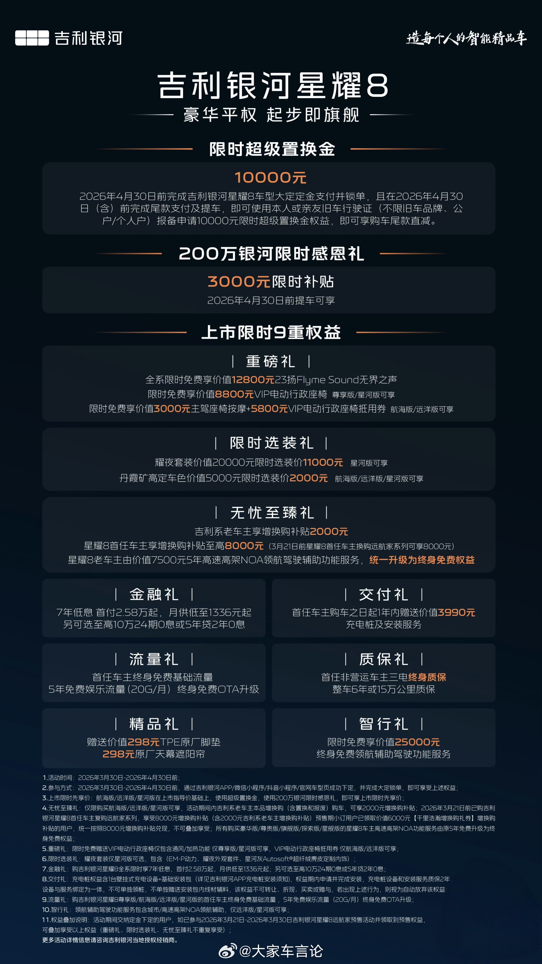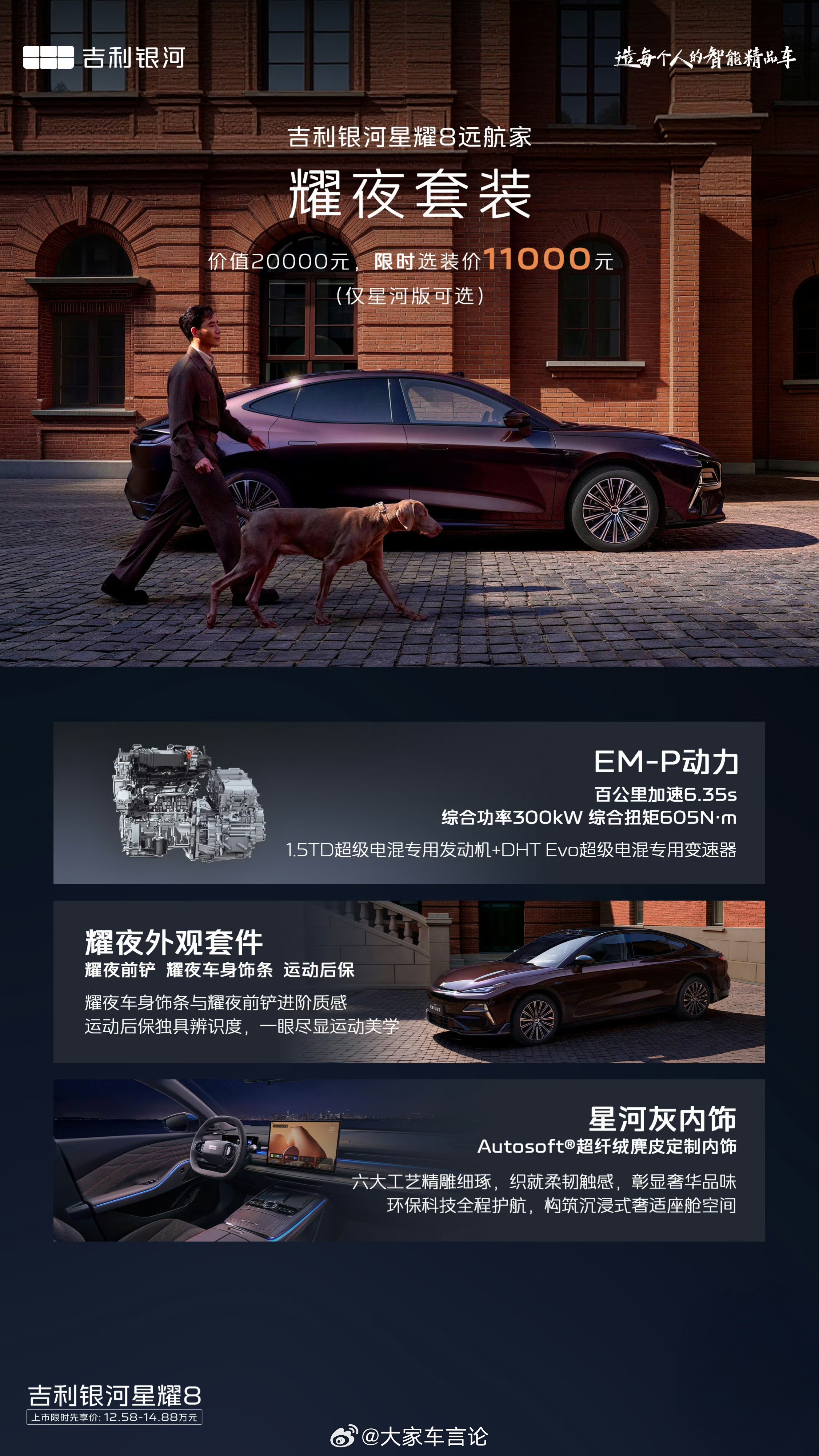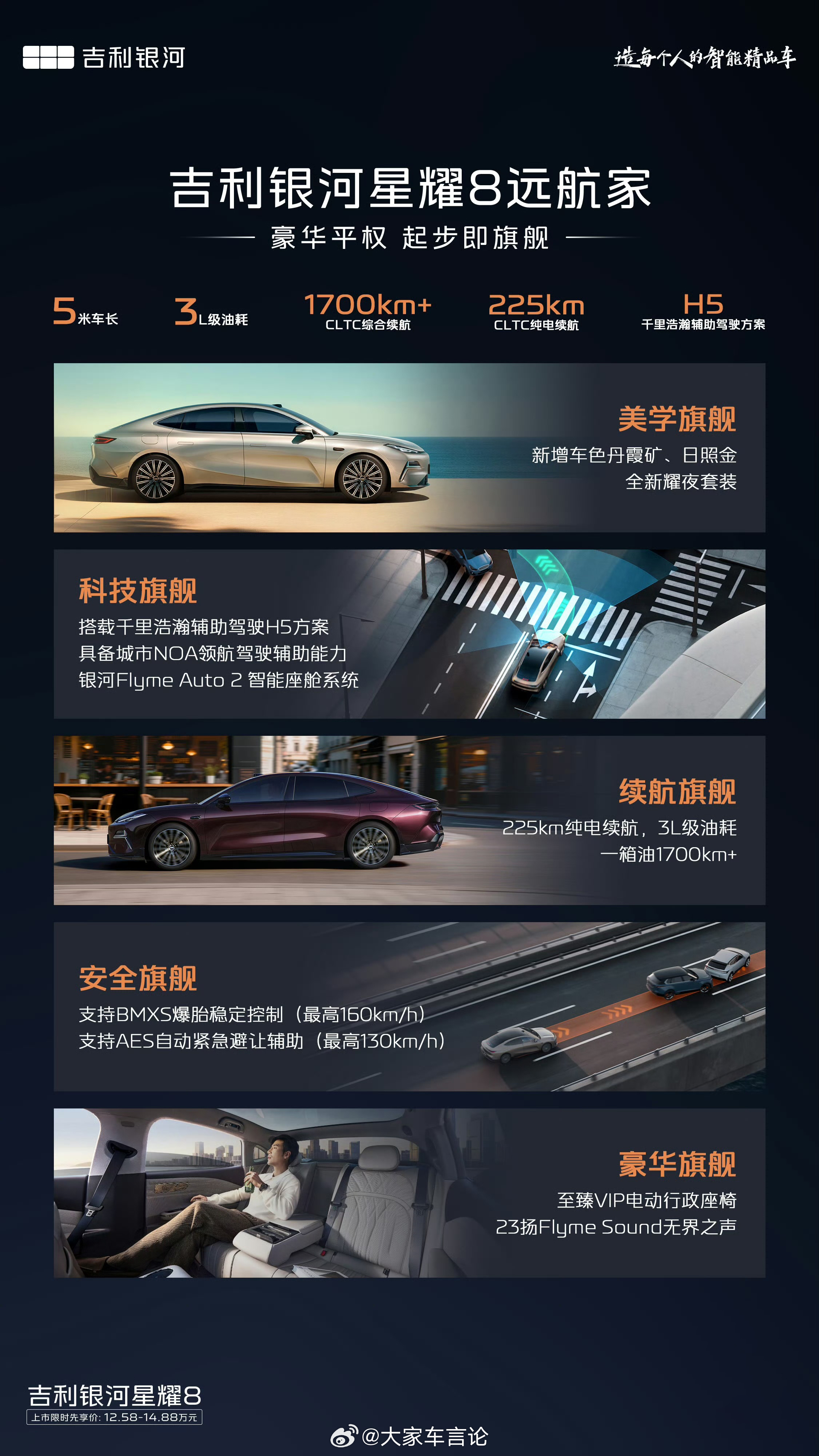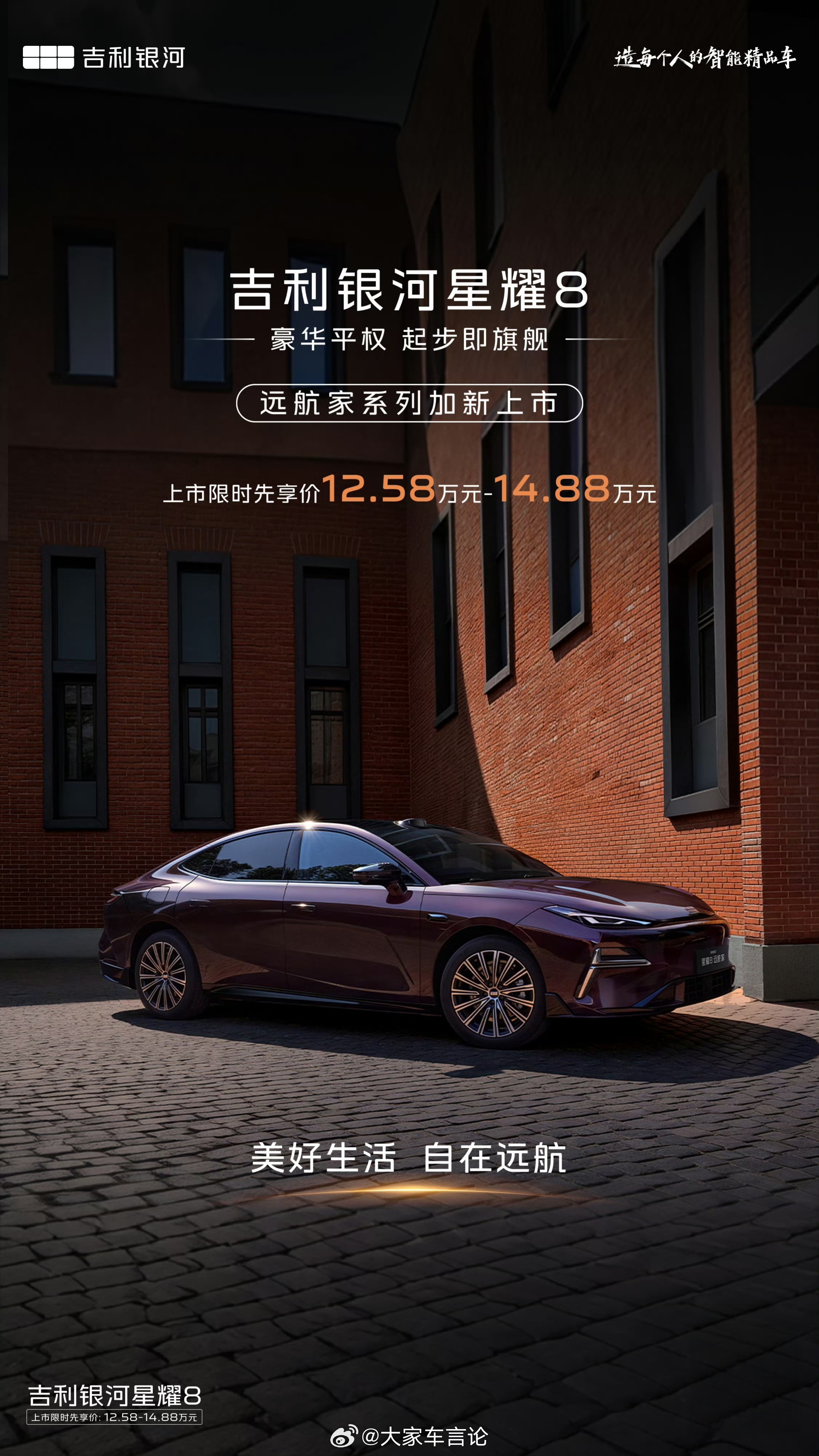 吉利银河星耀8远航家上市,限时权益价12.58万起售。推出4款配置,主打智驾和纯