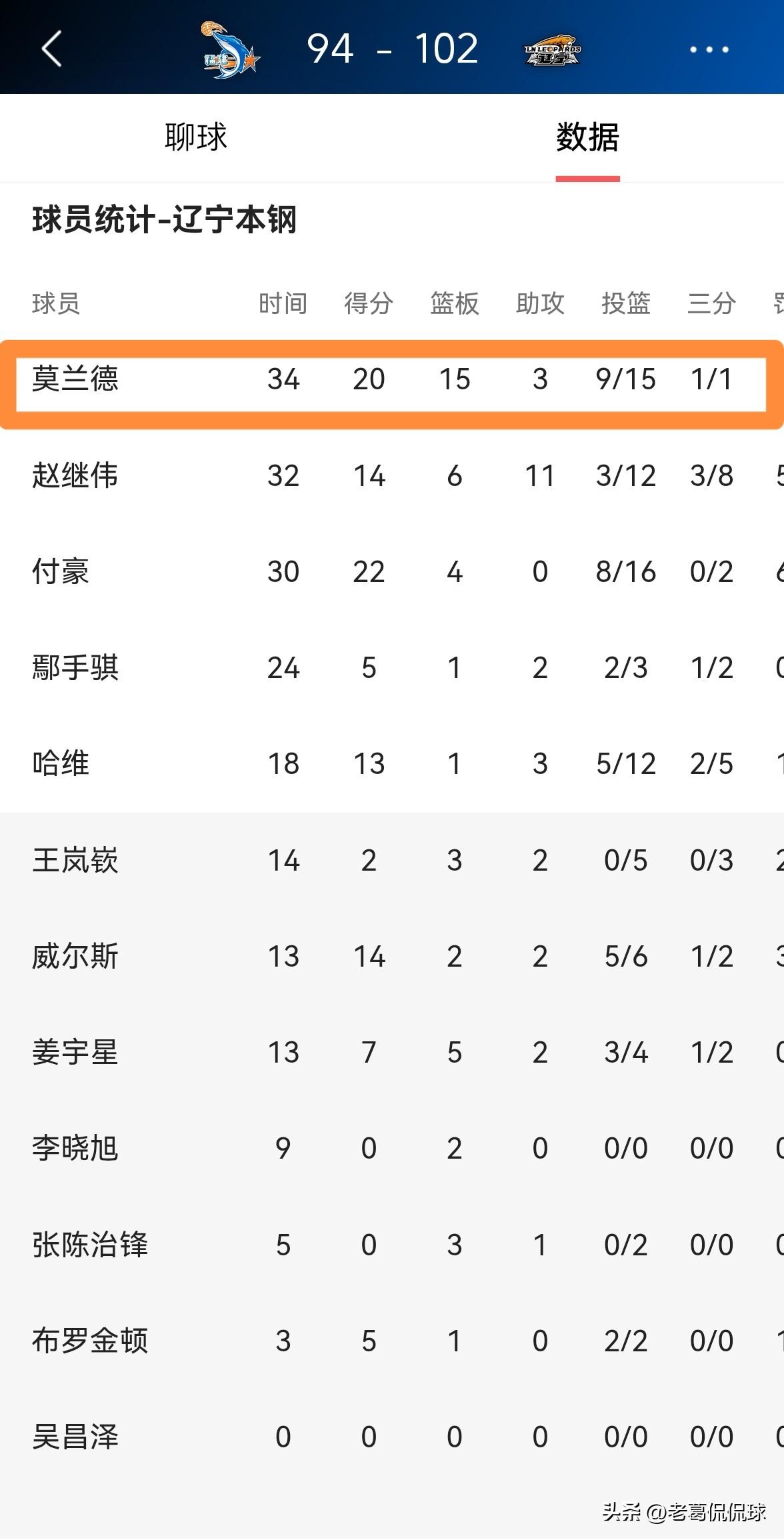 辽宁本钢外援莫兰德真是功不可没呀!在今天辽宁本钢客场以102:94力克福建晋江文旅的比赛中,莫兰德不仅豪取两双,而且在攻防两端为球队提供了非常大的帮助,堪称球队获胜的最大功臣。 全场比赛下来,莫兰德首发出战34分钟,投篮15中9,其中三分球1中1、罚球2中1相当高效的砍下20分,还有15篮板3助攻2抢断,他的场上正负值为+4。 事实再次证明,虽然莫兰德已经34岁了,但是莫兰德依然是辽宁本钢的擎天博玉柱。