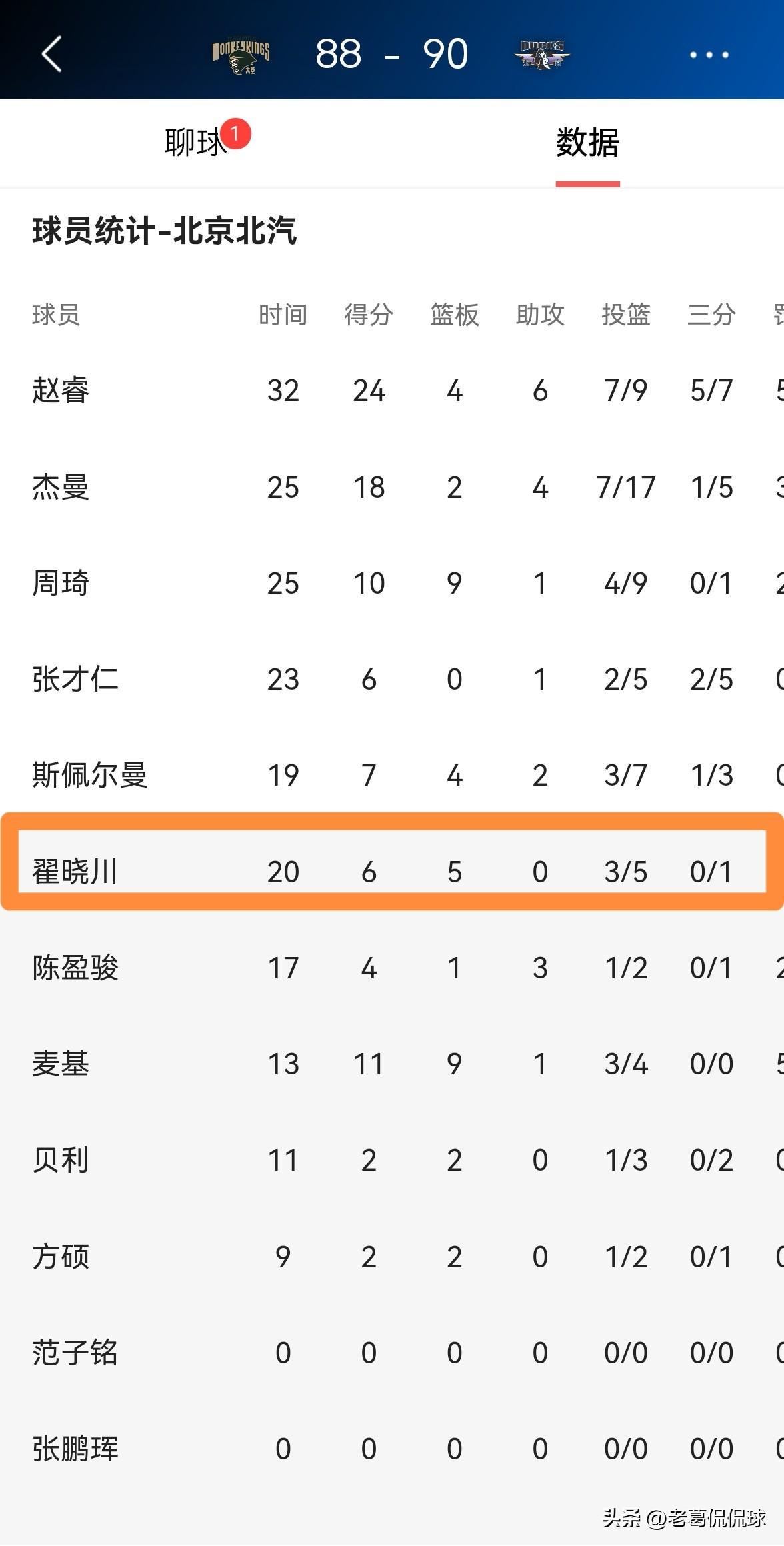 我必须要好好夸夸北京北汽老将翟晓川!在今天北京北汽客场以90:88险胜南京天之蓝的比赛中,虽然翟晓川在进攻端的戏份不多,但是他在攻防两端都拼尽全力,为球队的获胜做出了非常大的努力。 整场比赛下来,翟晓川替补出战20分钟,投篮5中3,其中三分球1中0得到6分5篮板,没有出现任何的失误,他的场上正负值为+2。 事实证明,当比赛进入到关键时刻的时候,翟晓川依然能够担当重任,翟晓川依然是北京北汽的主心骨之一。