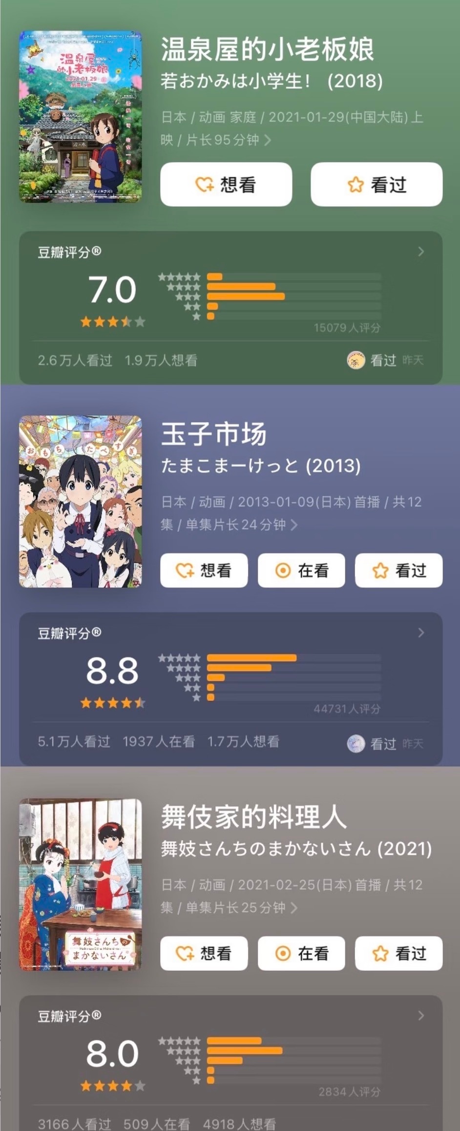 7、《温泉屋的小老板娘》是一部很暖心治愈系电影,讲的是女主角小织在遭遇父母离世后,帮助年迈外婆打理温泉屋旅馆,并逐渐成长的故事。8、《玉子市场》是一部日本原创深夜动画。讲述了兔山商店街年糕店的北白川玉子和朋友们之间羁绊的故事。9、《舞伎家的料理人》讲述一个乡下来的小姑娘意愿成为舞伎,却阴差阳错成为了舞伎家的大厨的故事。