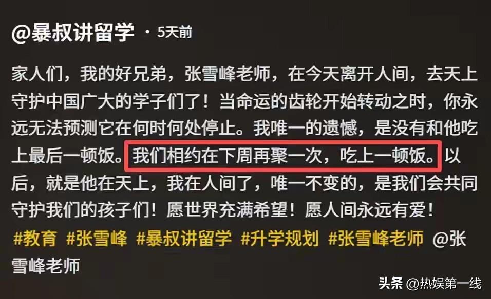 5天终有结果!张雪峰接班人敲定,10岁女儿安排曝光却引全网担忧 张雪峰骤然离世后,峰学蔚来的传承成了所有人的牵挂,接班人敲定、女儿的安排也公之于众,可大家悬着的心却依旧放不下来。 离世第五天,峰学蔚来总经理武亮发文官宣接棒,他与张雪峰亦师亦友相伴五年,曾被约定参加其婚礼,如今带着承诺扛起这份重任。武亮也明确了对10岁张姩菡的安排,会守护公司和张雪峰的账号,等孩子成年后,将一切完完整整交到她手上,这份安排暖了无数人的心。 张雪峰的善意从不张扬,提携暴叔涨粉千万、待员工如家人,001号员工万霞陪他从无到有,他记挂员工的生活,这份温情早已刻进团队。而峰学蔚来本就与他的个人IP深度绑定,他是公司的灵魂,专业度更是被大家奉为满分,这也成了武亮接棒后的最大考验。 传承从不是复刻,而是带着故人的期许稳步前行,有人扛起责任,有人被温柔守护,这便是最好的告慰。 你是否相信武亮能守住张雪峰的这份事业,静待张姩菡长大?