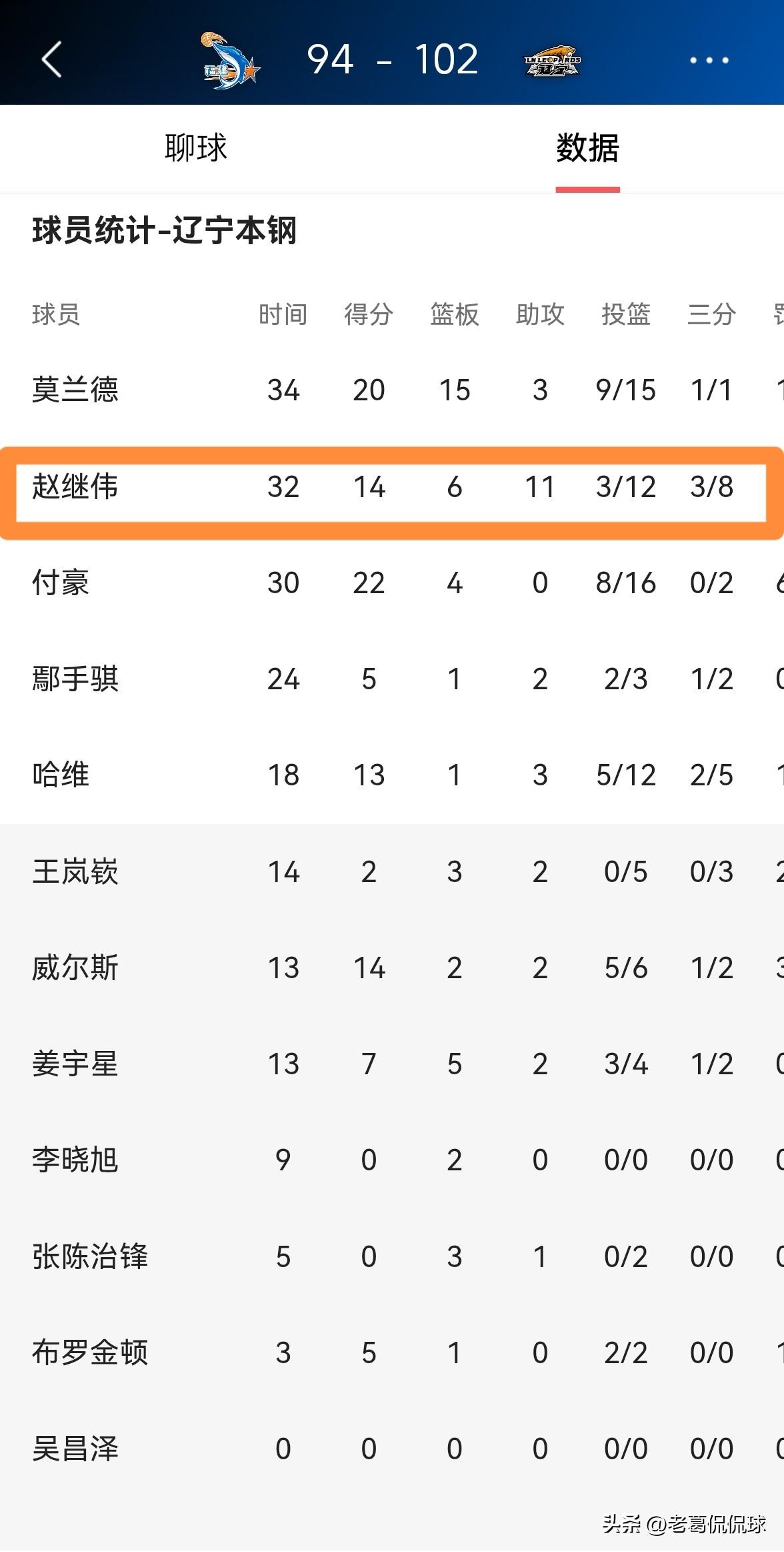 辽宁本钢当家控卫赵继伟真是让人既爱又恨!在今天辽宁本钢客场以102:94战胜福建晋江文旅的比赛中,赵继伟首发出战32分钟,投篮12中3,其中三分球8中3、罚球5中5非常低效的得到14分,不过有6篮板11助攻1抢断,他的场上正负值为+8。 实事求是的说,当我看到赵继伟在场上频频的投篮打铁时,我真是恨死他了;然而当我目睹赵继伟一次又一次的为队友送出妙传时,我又特别的喜欢他的传球。