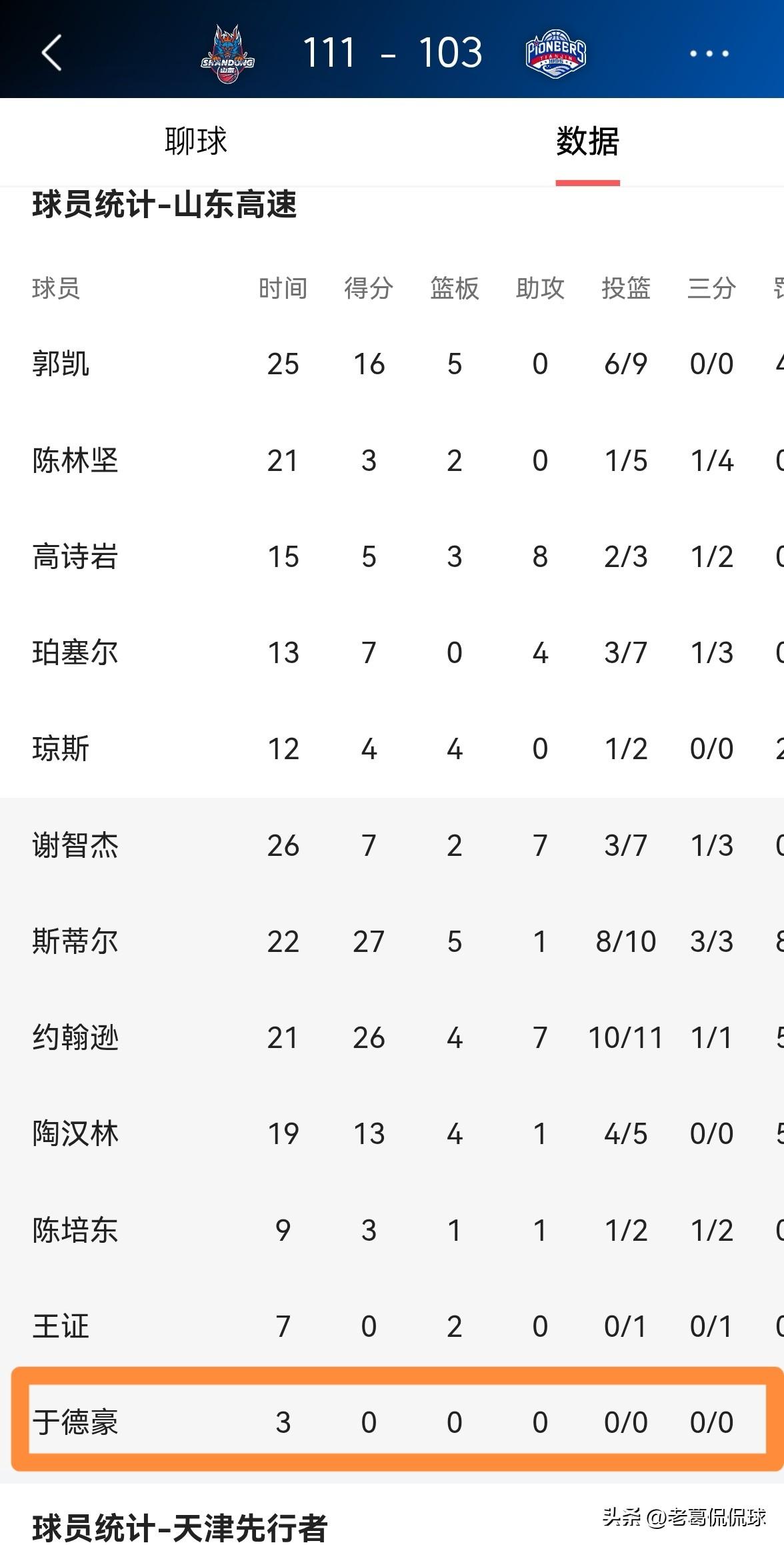 山东高速大将于德豪真是毫无存在感!尽管今天山东高速在主场以111:103击败天津先行者,但是于德豪在替补登场以后对球队毫无贡献,完全没有任何的存在感。 全场比赛下来,于德豪替补出战3分钟,没有捞到任何的出手机会怒砍0分0篮板0助攻,不过有1次抢断和1次失误。 老实说,每当我看到于德豪登场,我都为他感到悲哀。说句不好听的,于德豪就像球队的吉祥物一样,他的登场只是为了让高诗岩稍微的喘口气而已。