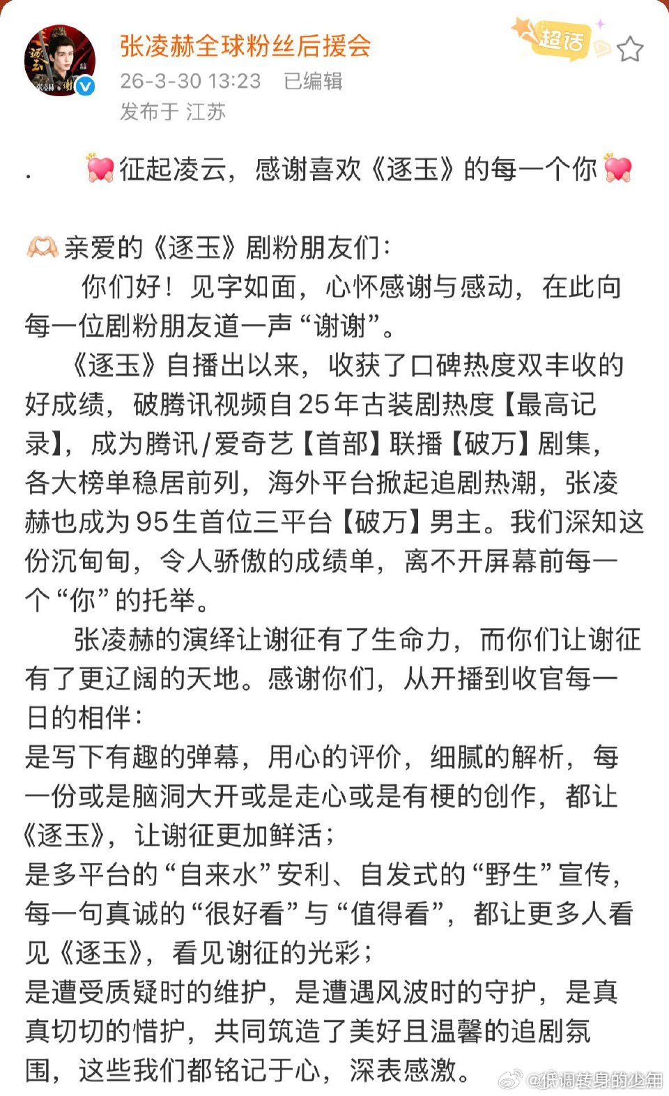 张凌赫粉丝感谢剧粉张凌赫全体粉丝给《逐玉》剧粉写了感谢信,致谢逐玉剧粉一路托举支