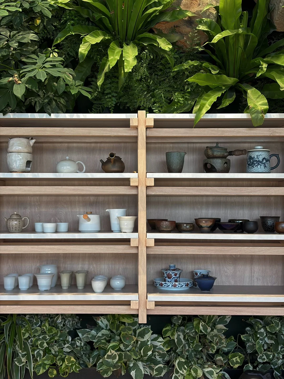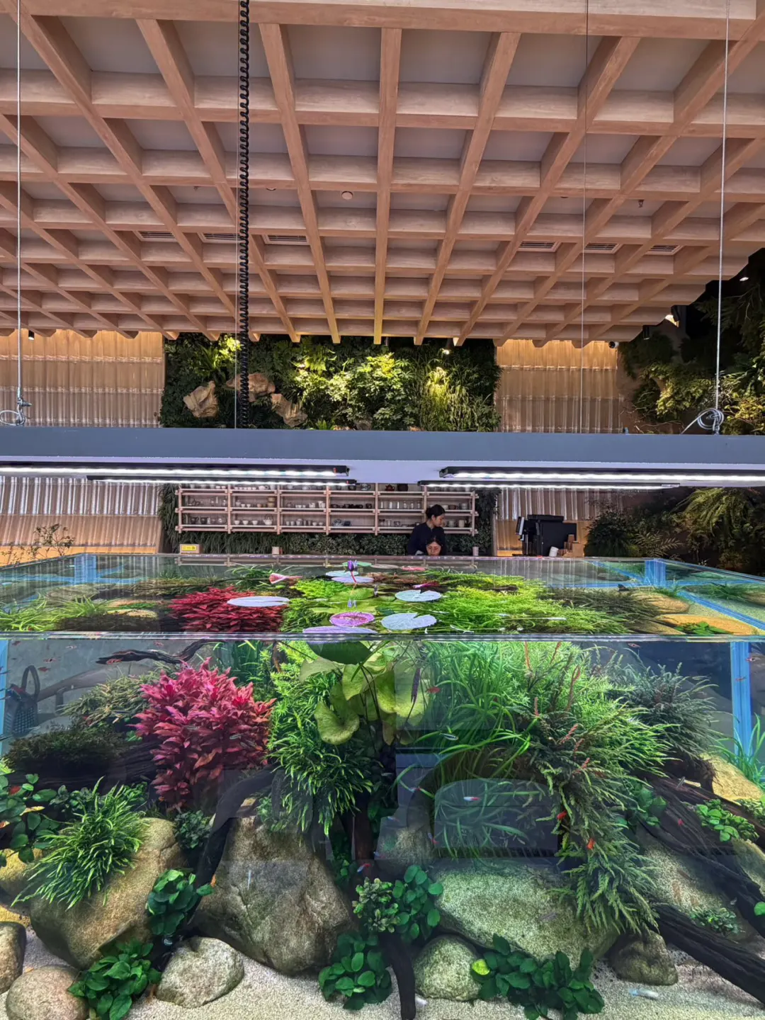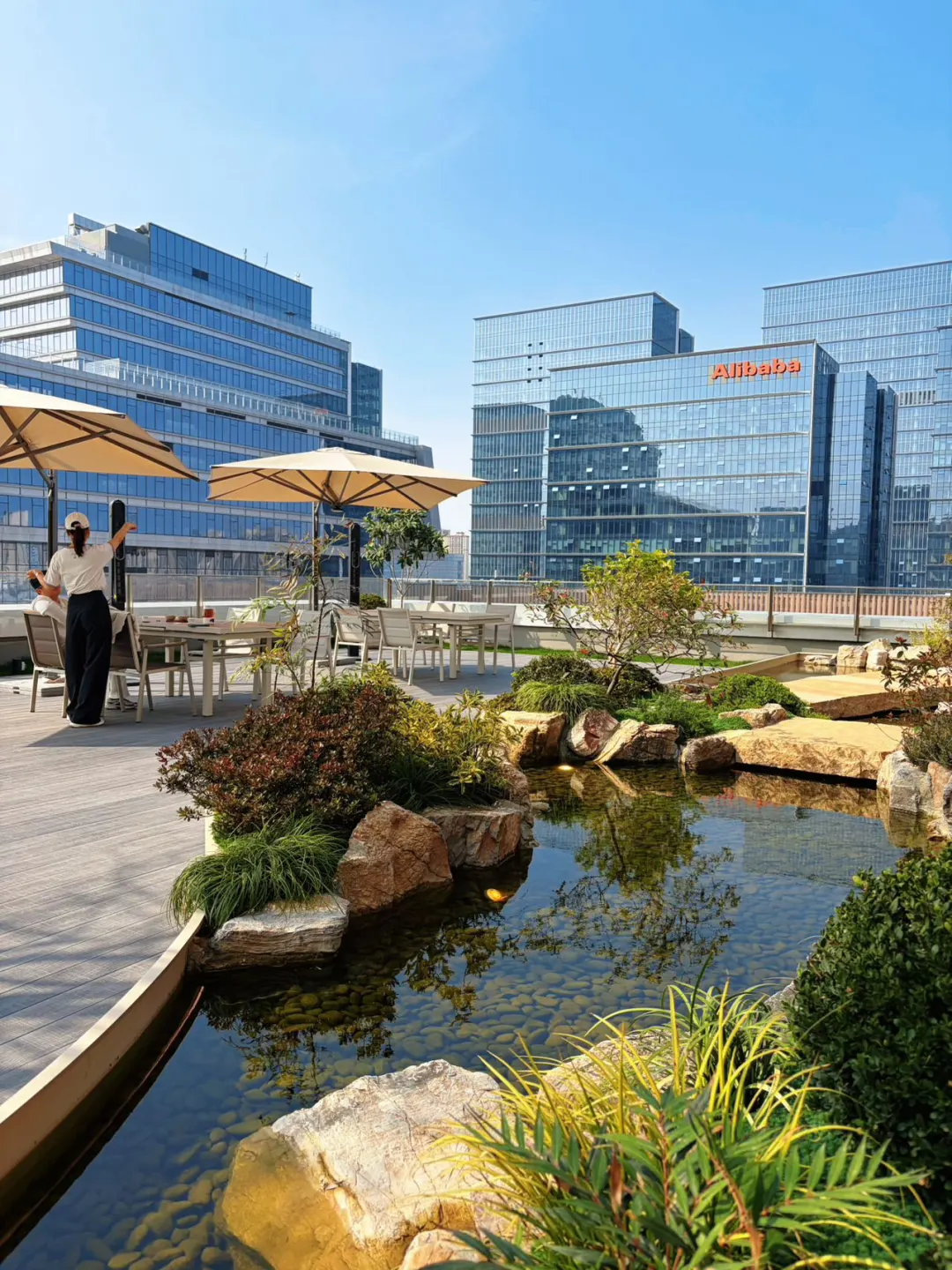室外露台也足够惊喜,一池春水映衬蓝天,抬头是CBD的摩天大厦,脚下是森系中式庭院,这种“闹中取静”的割裂感,太适合放空了。