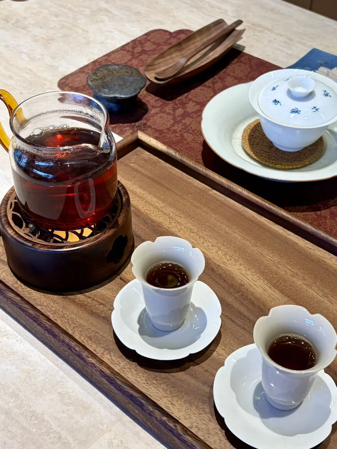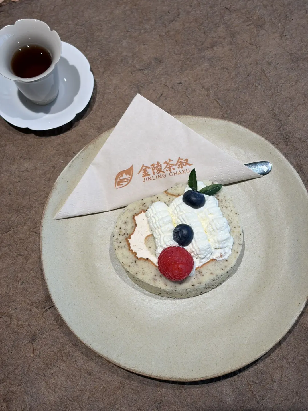 我们选了原木风的包间,私密性很好。不同于很多徒有其表的“网红”茶馆,作为一个爱茶人,能感觉到老板是有在认真经营,他家的茶种类很多,都是大品牌,我选了武夷星的大红袍,配着精致的瑞士卷,有种中西合璧的典雅。