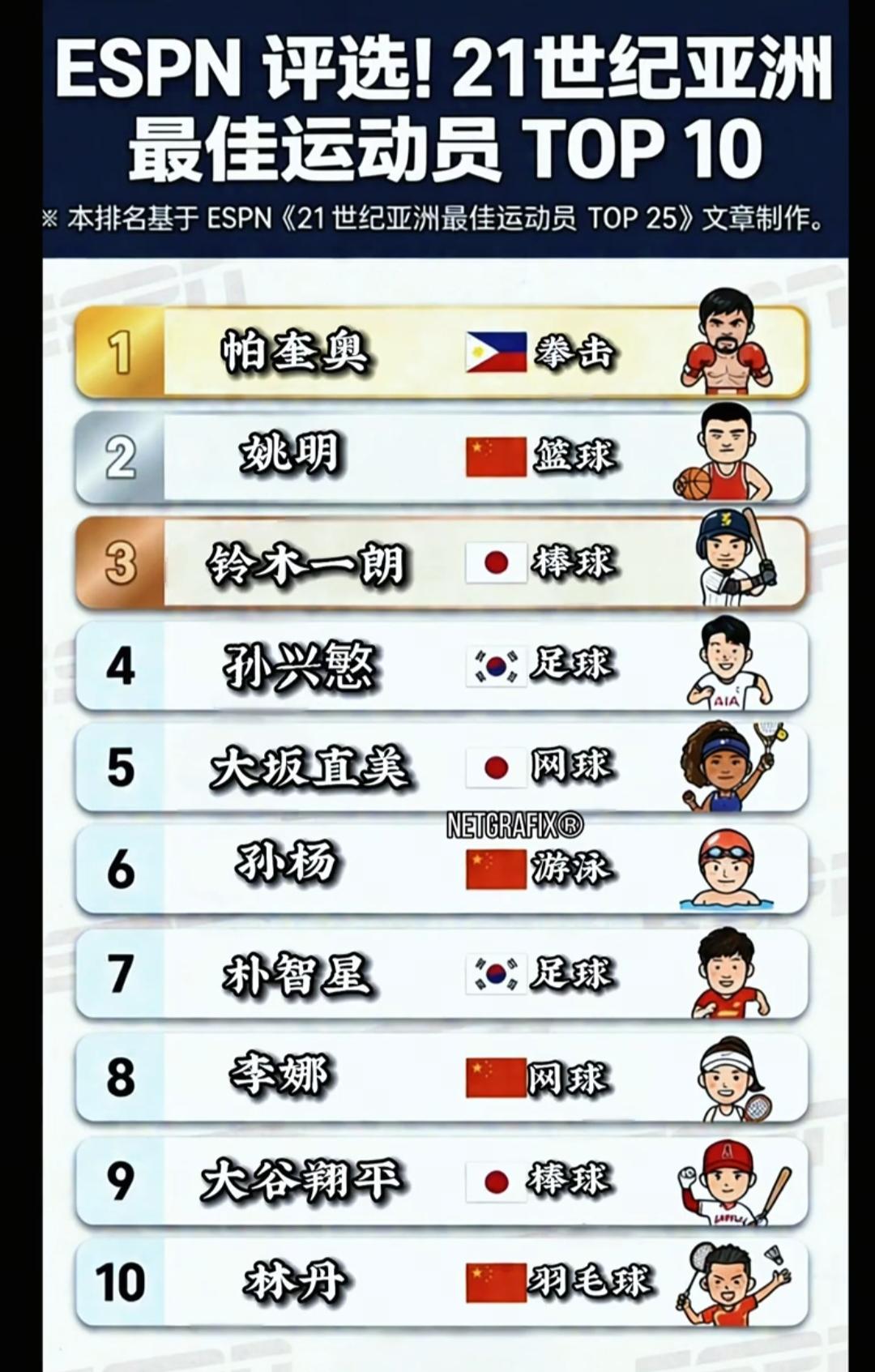 ESPN 21世纪亚洲最佳运动员TOP10揭晓!