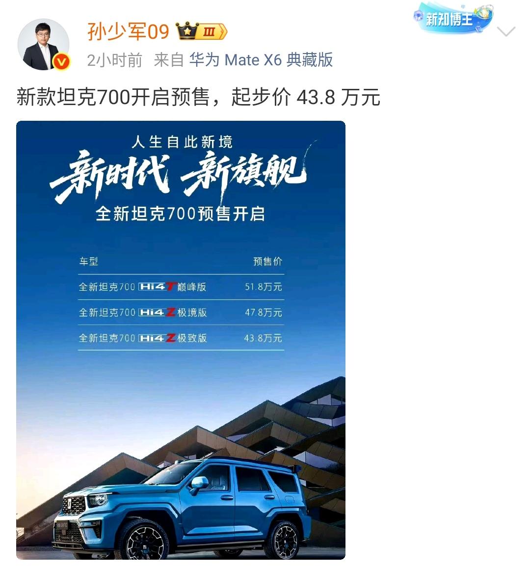 孙少军:新款坦克700开启预售,起步价 43.8 万元! 可能有部分消费者对于坦克400和坦克700,外观上不太好区分,但见到实车之后能一眼识别出哪个车更贵。 坦克700的体量真的是相当的大,特别是停在标准车位的情况下,比旁边的车不止大上一圈。