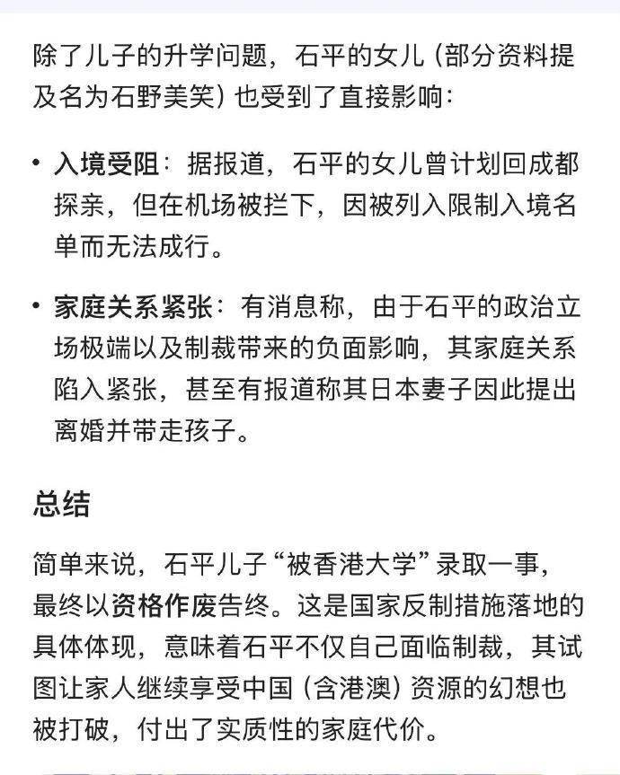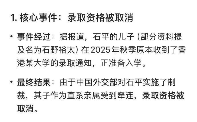 哈哈,还有这等好事。 谁叫你卖国当汉奸呢? 狗汉奸石平不仅自己遭殃还连累到子女。 儿子想去香港混张文凭也不行了,女儿想回国探亲也不行了。 这才对嘛。 既然不爱中国,就别来中国,什么都不要和我们沾边。 就是不知道高市被打脸的时候石平会不会勇敢地帮她挨。 点右上角关注我,我们一起去看这个魔幻的世界