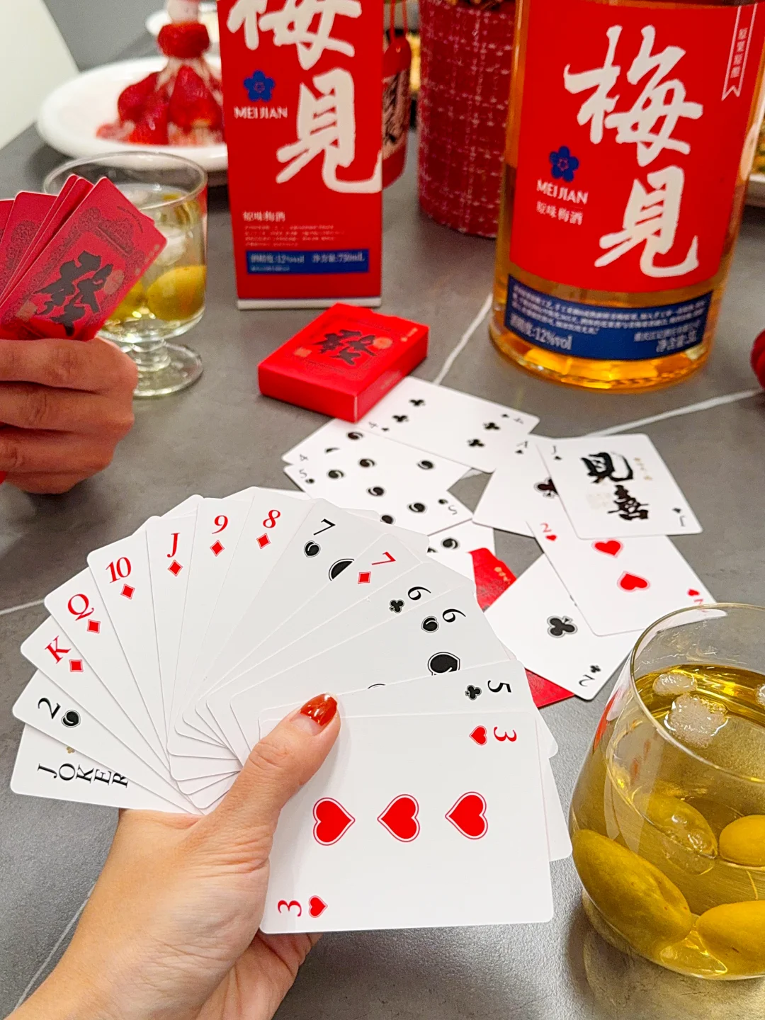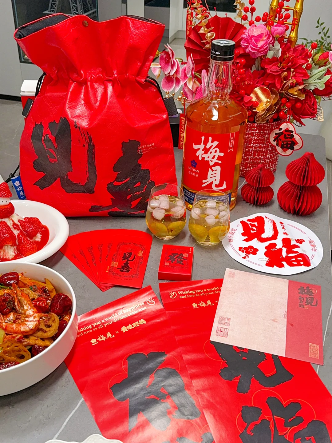 [向右R]而且过年的时候吃的油腻,搭配这个梅见就非常解腻,这里面富含天然有机酸(是苹果的9倍,柠檬的2.3倍)对咱们消化好,爱美的小仙女也不用担心有负担~这次的新年酒还有不少周边,像背包、春联、红包、窗贴、扑克啥的...红彤彤的看起来就很喜庆![哇R][哇R][哇R]