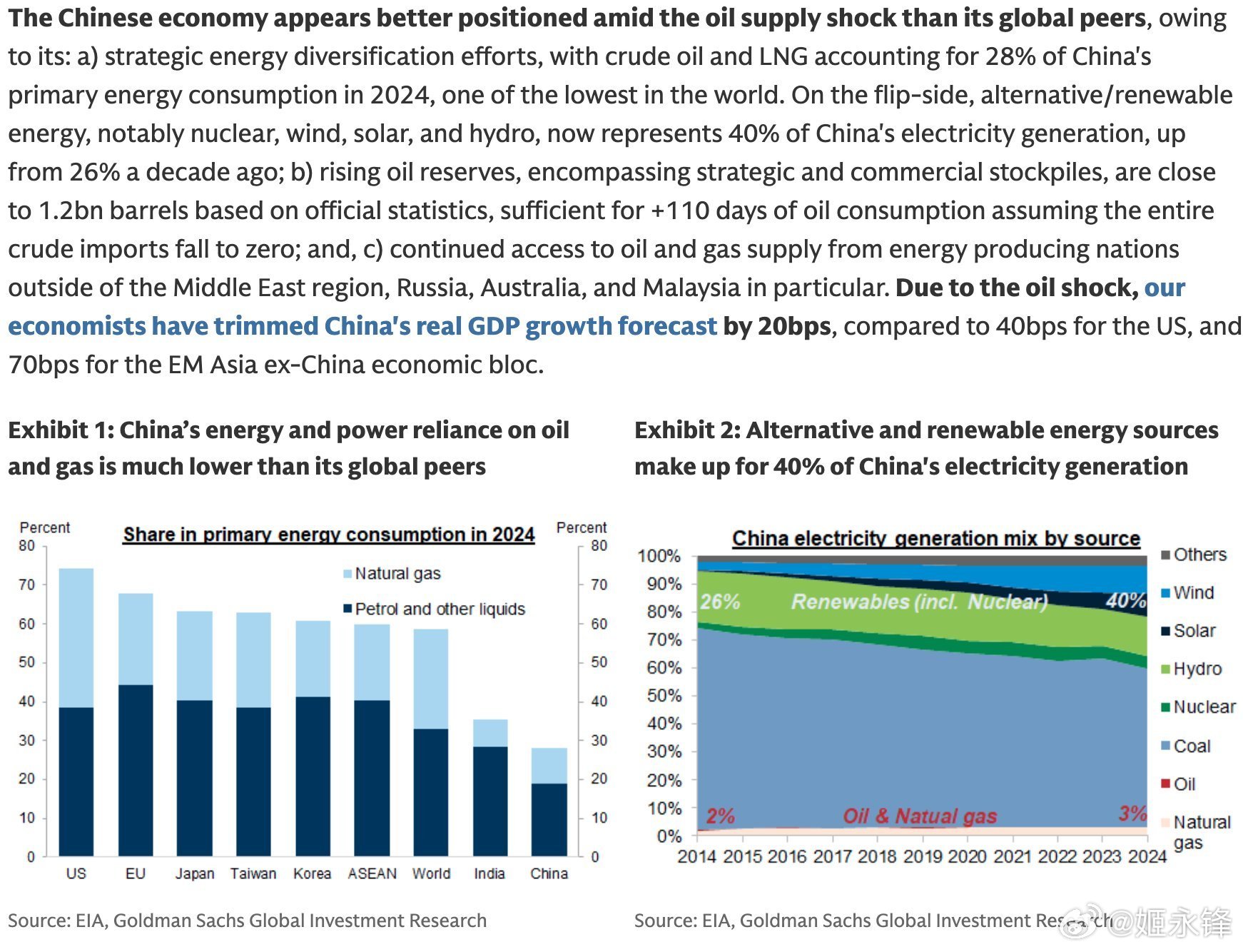 "在全球石油供应冲击中,中国经济似乎比其全球同行处于更有利的位置 [...] 由于石油冲击,我们的经济学家将中国的实际GDP增长预测下调了20个基点,而美国则下调了40个基点"