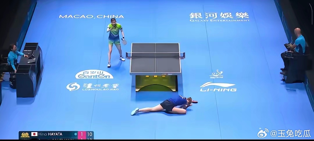 打着打着,考夫曼趴在了地上,早田以为对手也就摔一下,马上就会起来,没想到考夫曼半天没起来。早田慌忙跑过来观看考夫曼的情况,发现她两条腿劈叉摔在了地上。